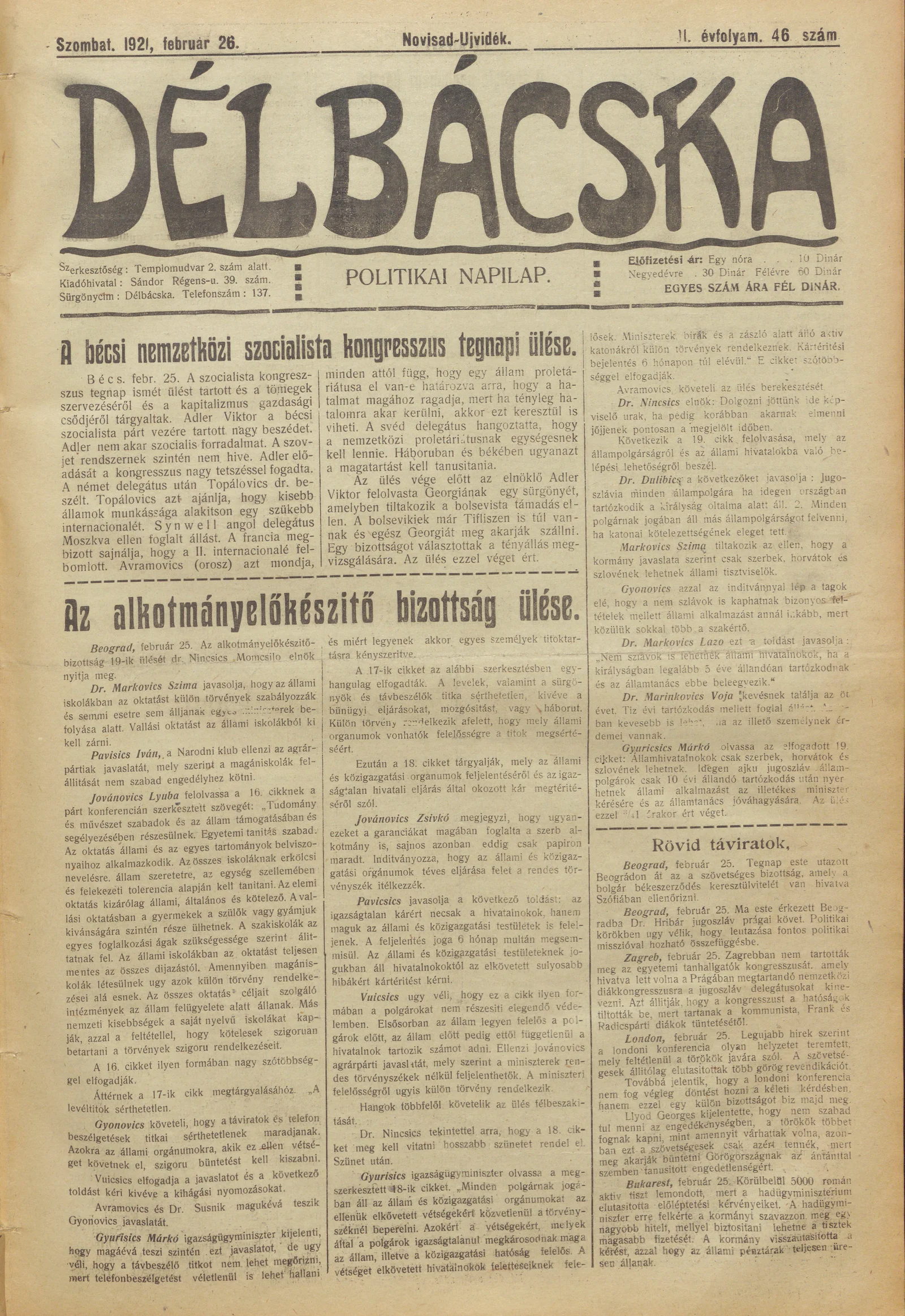 Délbácska, 2. évf. 1921. február 26. 46. sz.