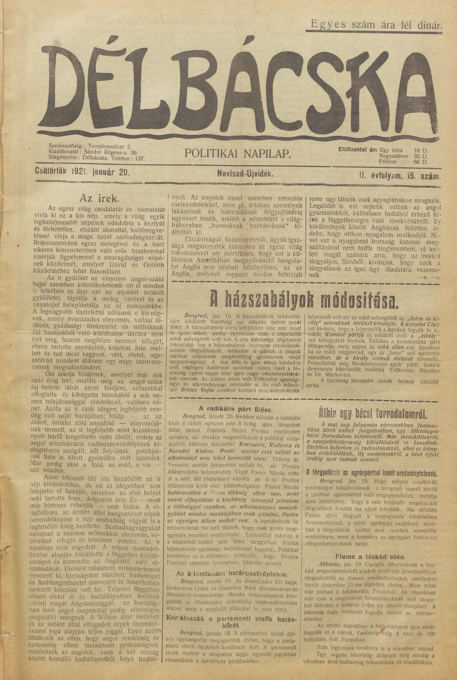 Délbácska, 2. évf. 1921. január 20. 15. sz.