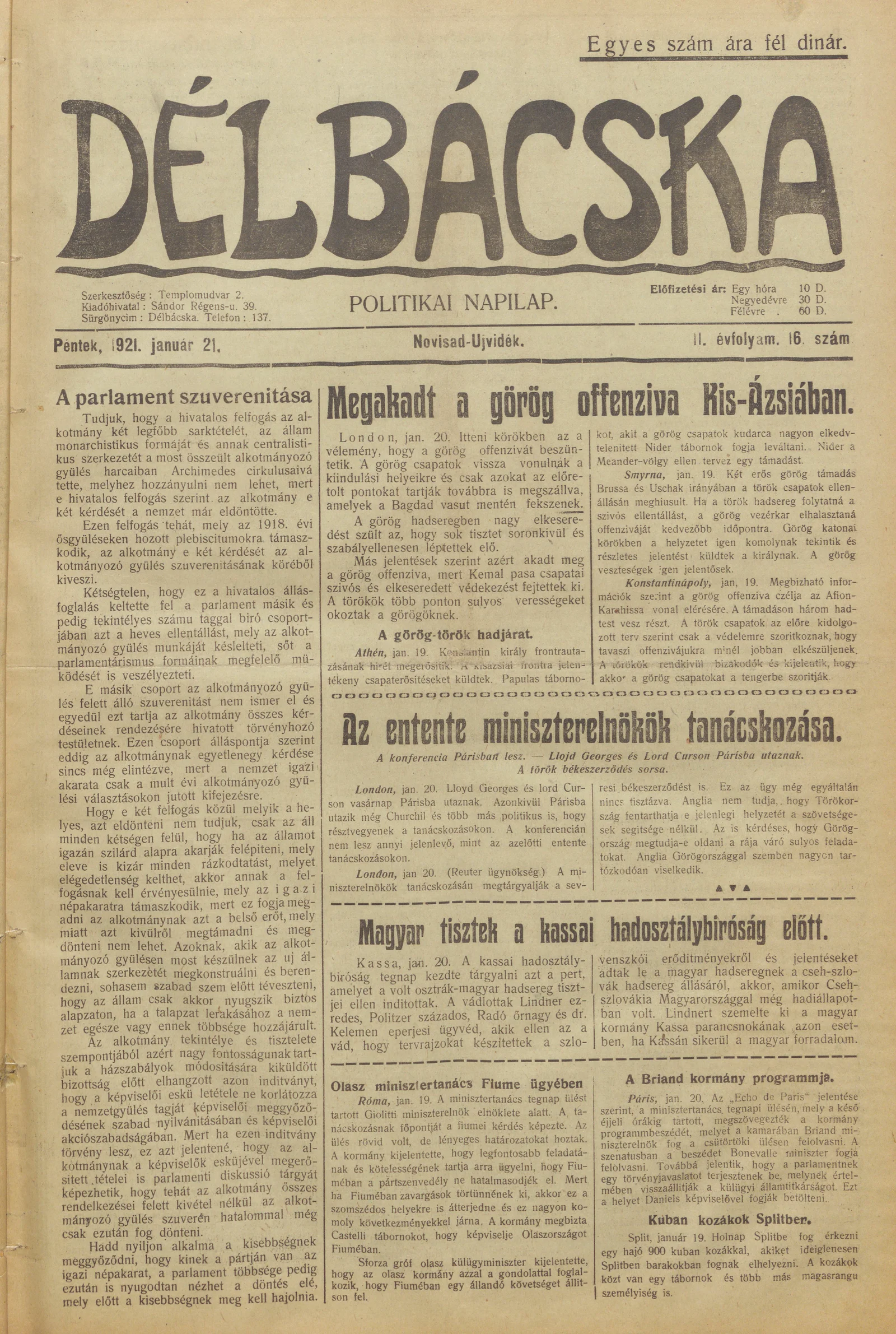 Délbácska, 2. évf. 1921. január 21. 16. sz.
