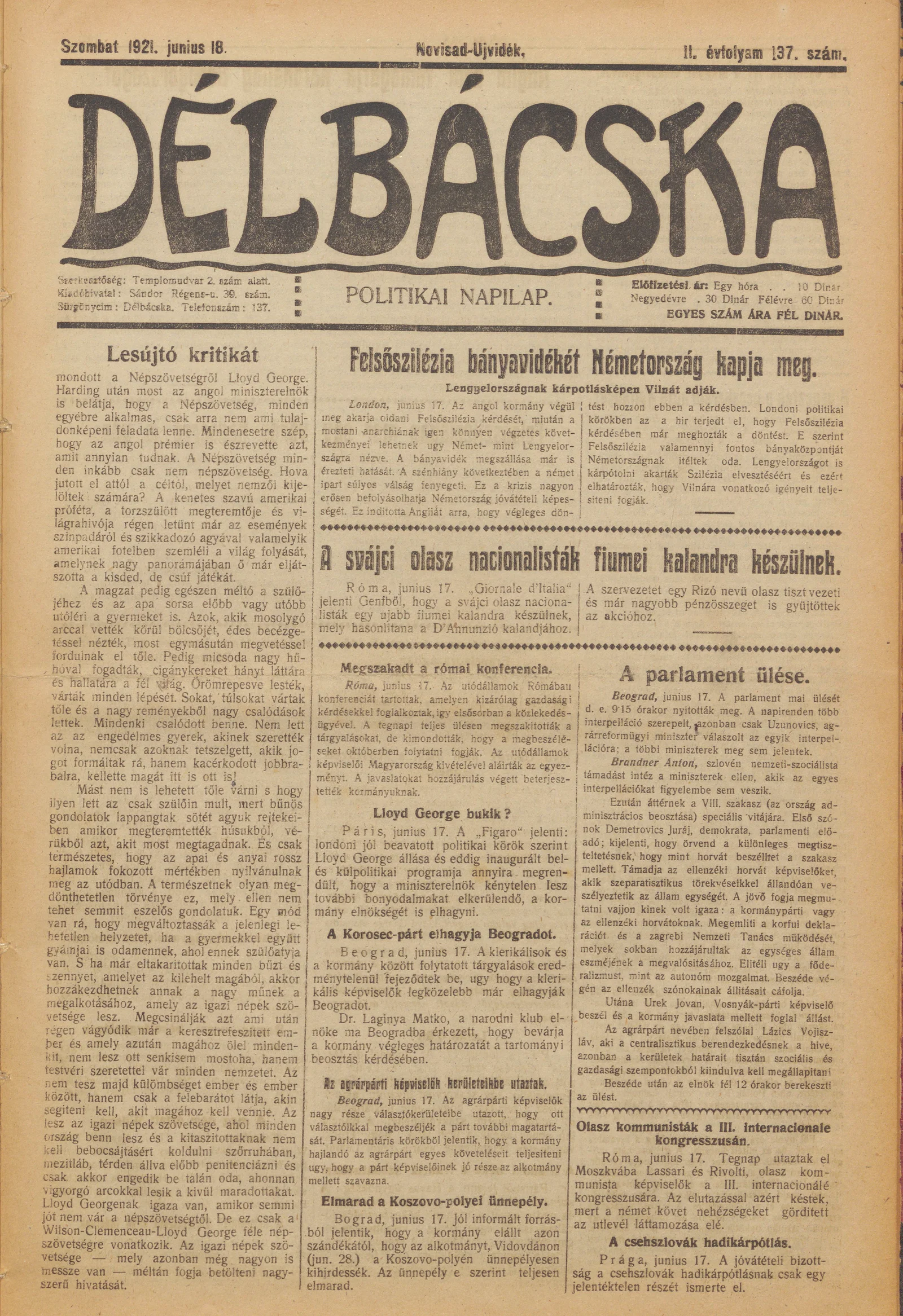 Délbácska, 2. évf. 1921. június 18. 137. sz.
