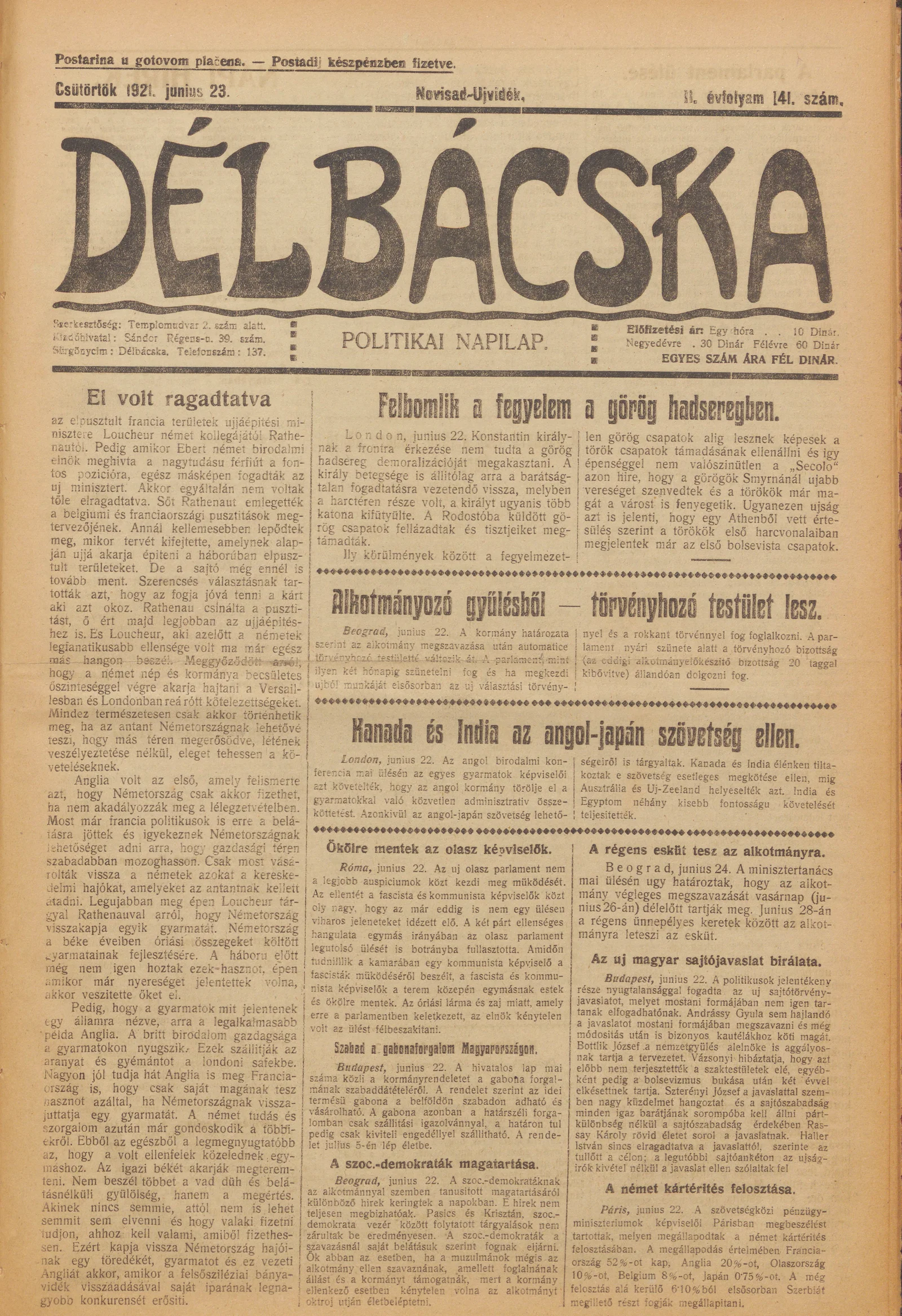 Délbácska, 2. évf. 1921. június 23. 141. sz.