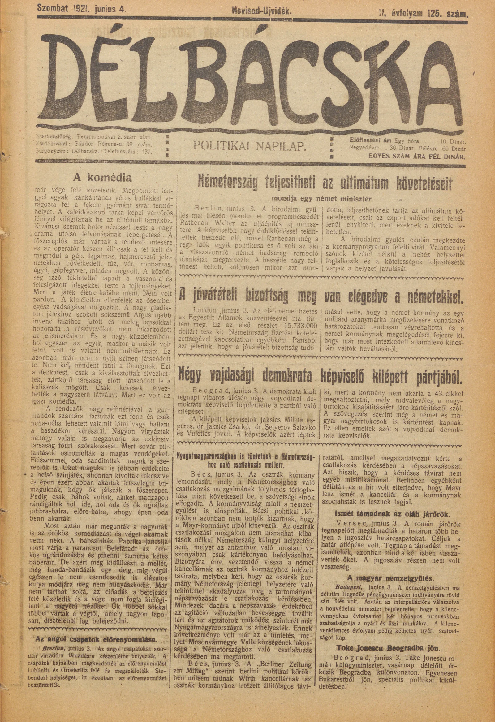 Délbácska, 2. évf. 1921. június 4. 125. sz.