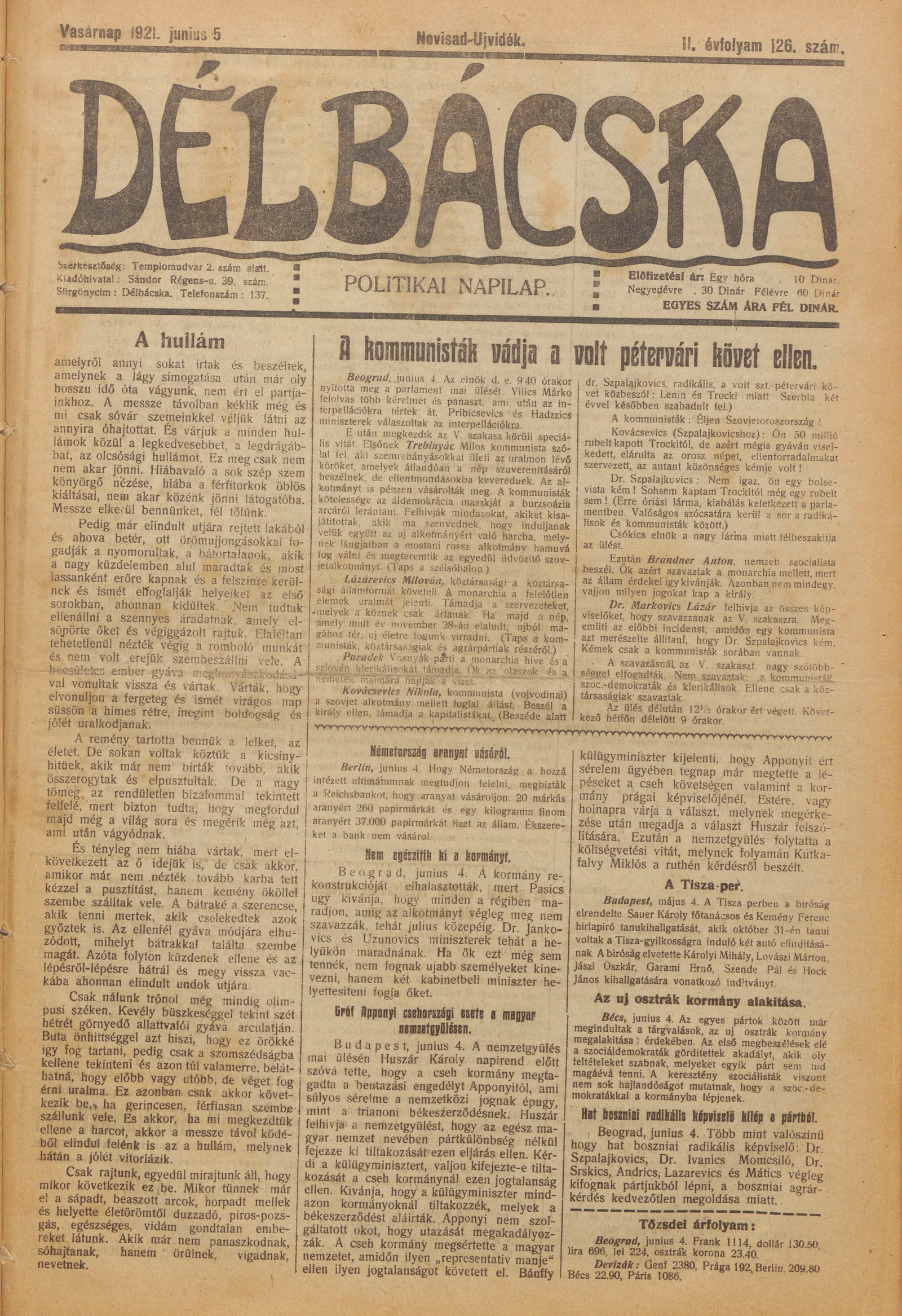 Délbácska, 2. évf. 1921. június 5. 126. sz.