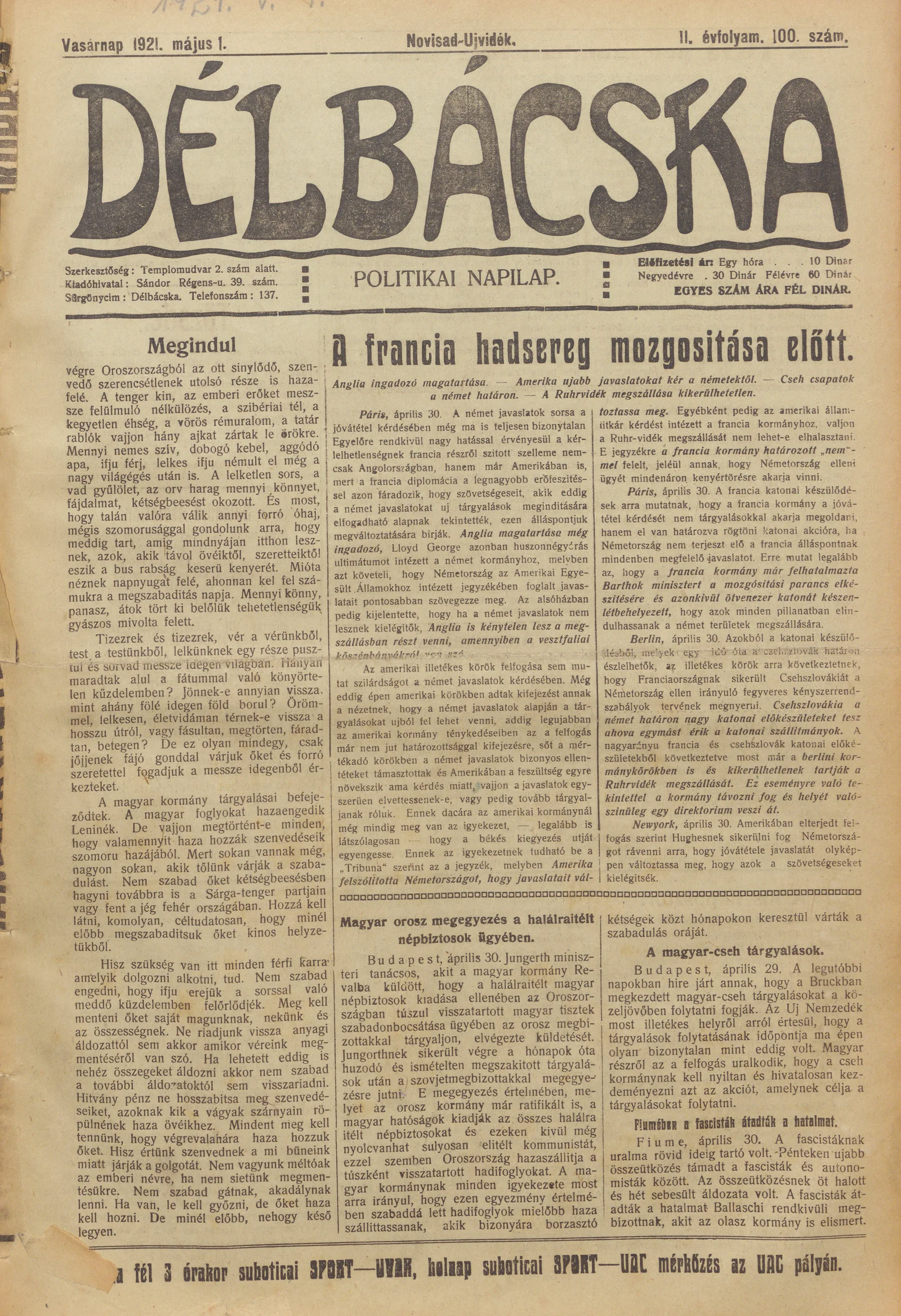 Délbácska, 2. évf. 1921. május 1. 100. sz.