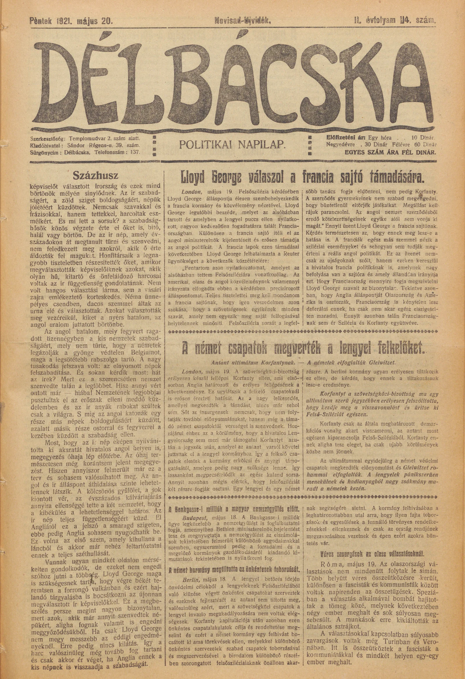 Délbácska, 2. évf. 1921. május 20. 114. sz.