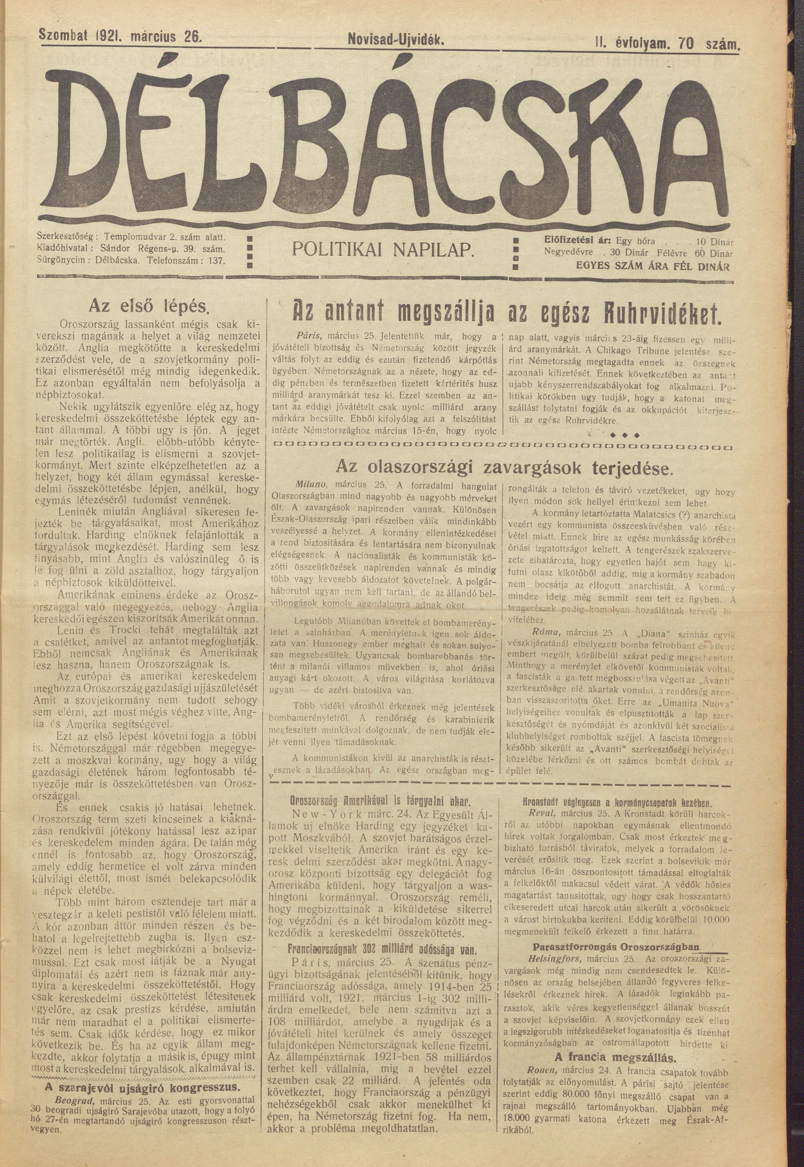 Délbácska, 2. évf. 1921. március 26. 70. sz.