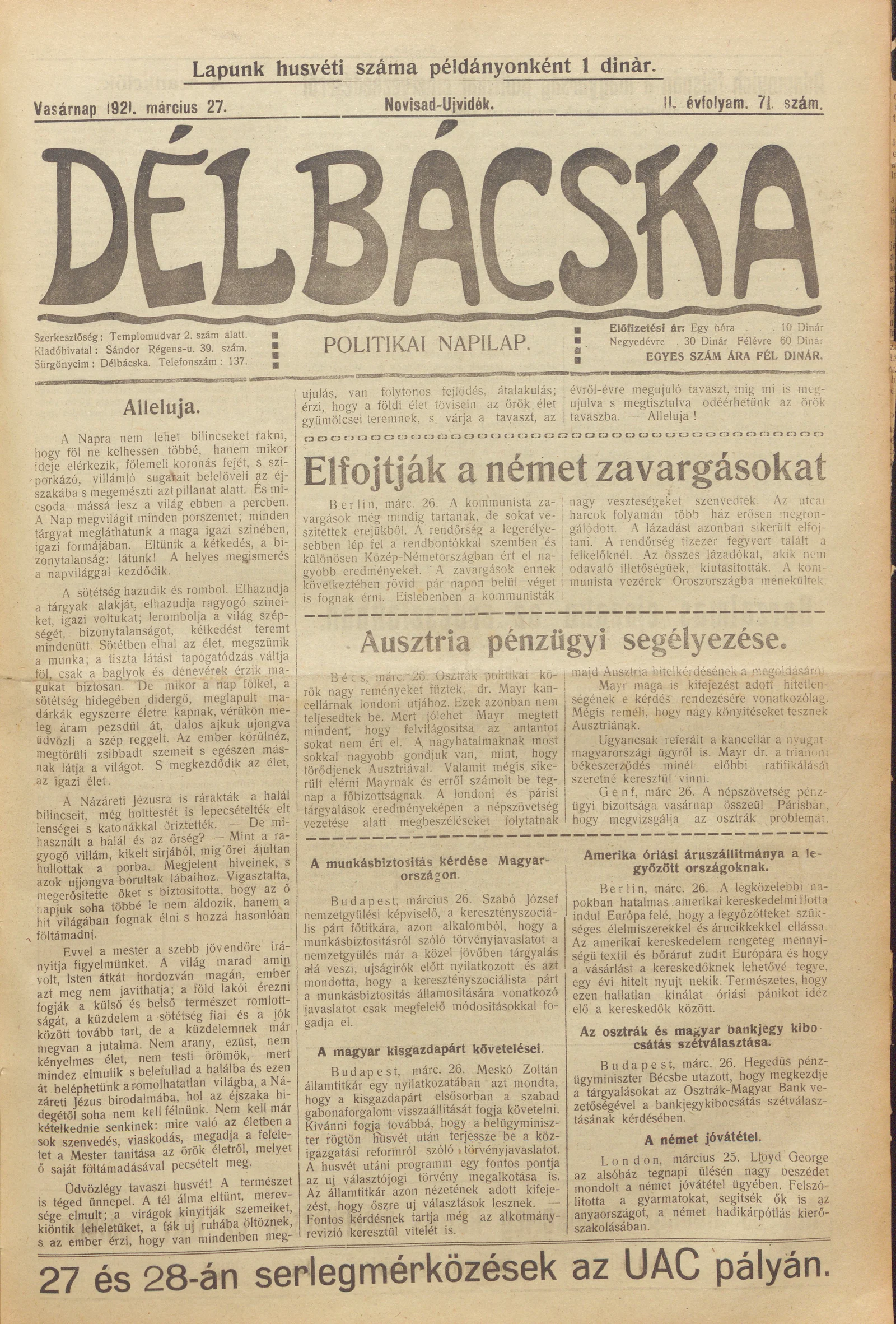 Délbácska, 2. évf. 1921. március 27. 71. sz.