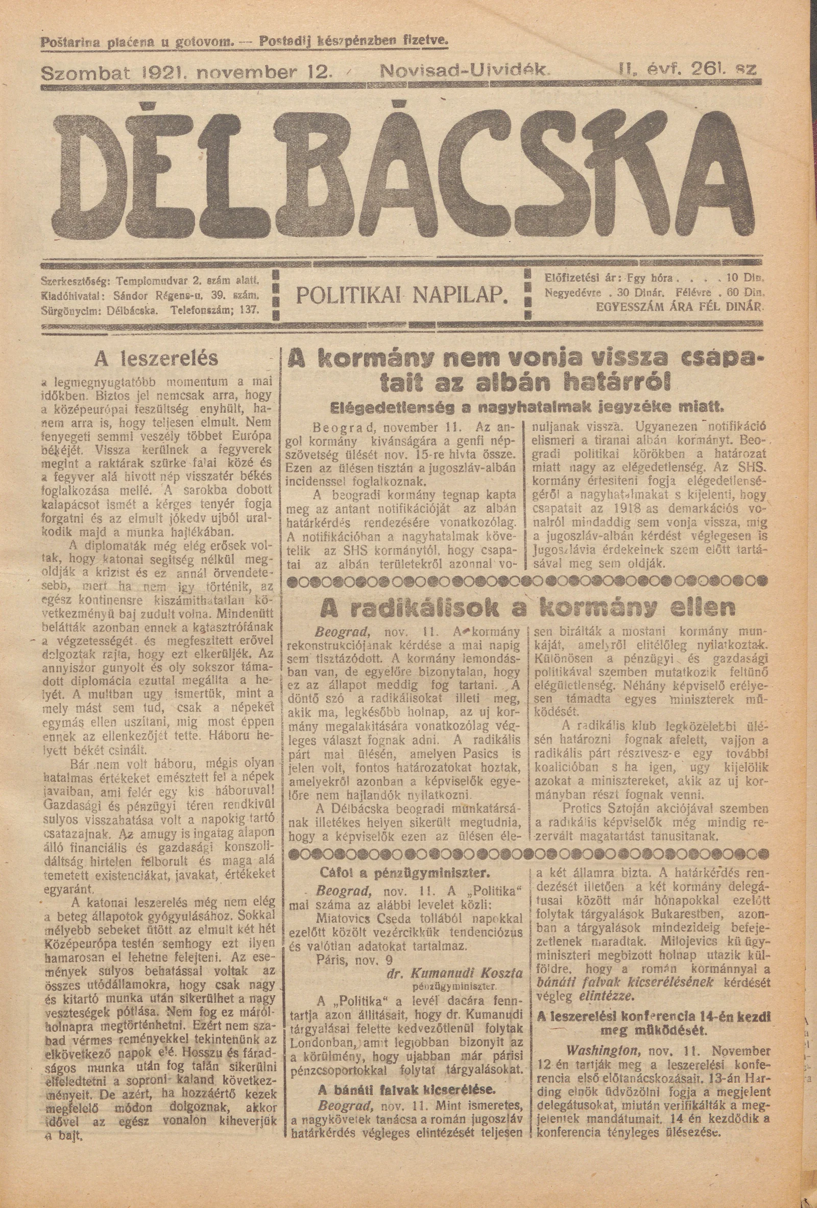 Délbácska, 2. évf. 1921. november 12. 261. sz.