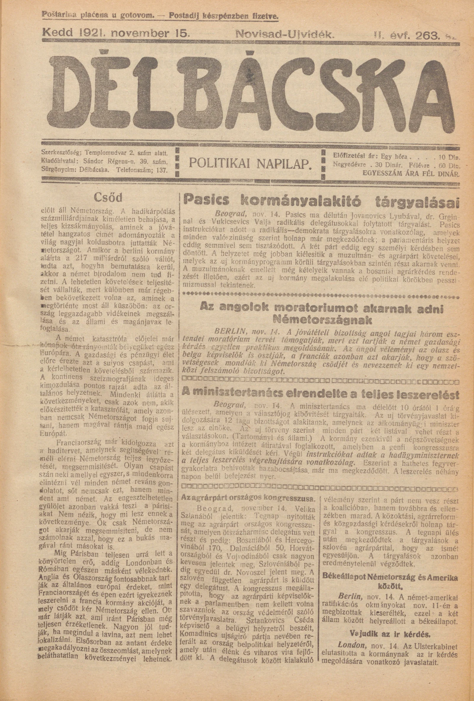 Délbácska, 2. évf. 1921. november 15. 263. sz.