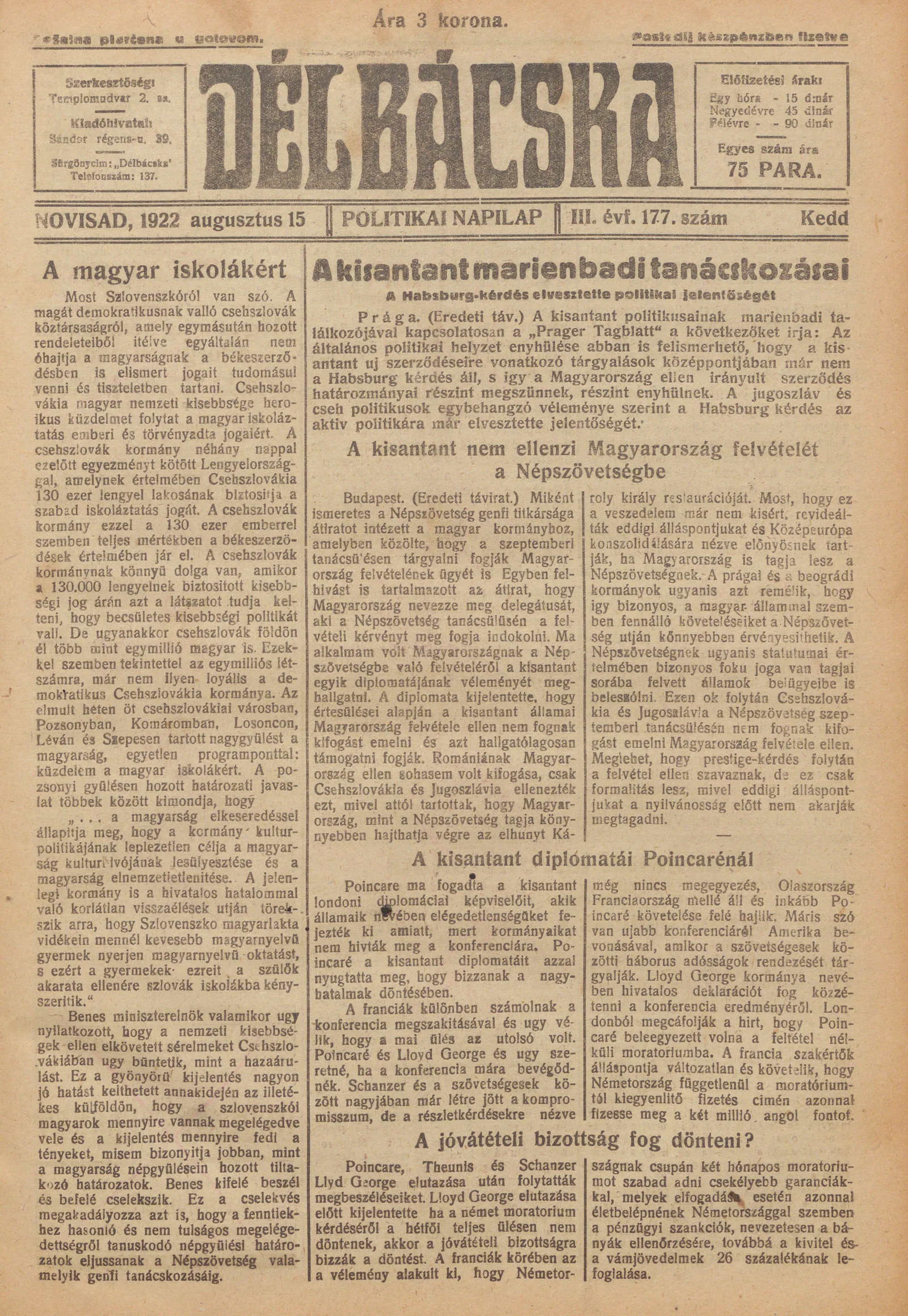 Délbácska, 3. évf. 1922. augusztus 15. 177. sz.