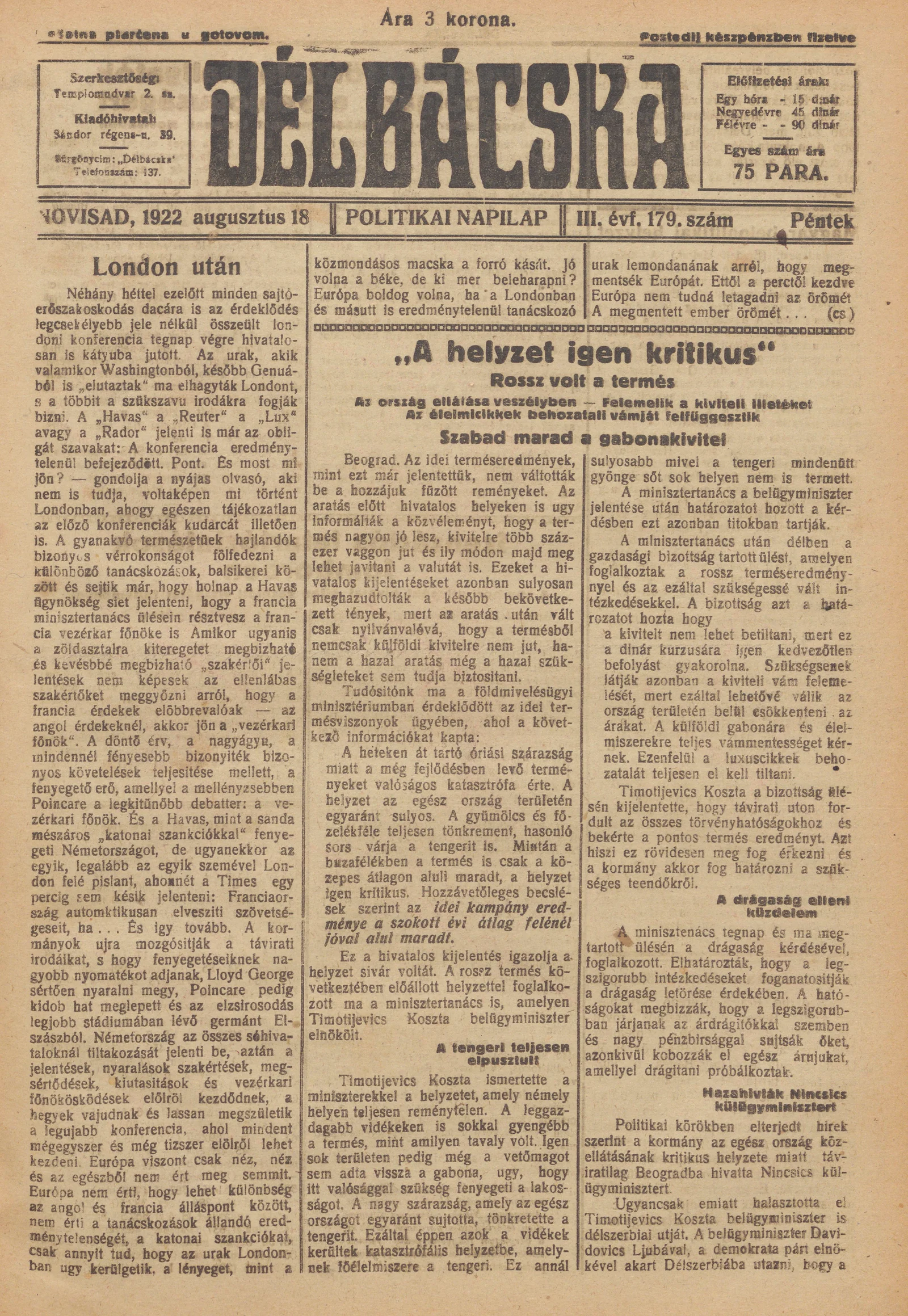 Délbácska, 3. évf. 1922. augusztus 18. 179. sz.