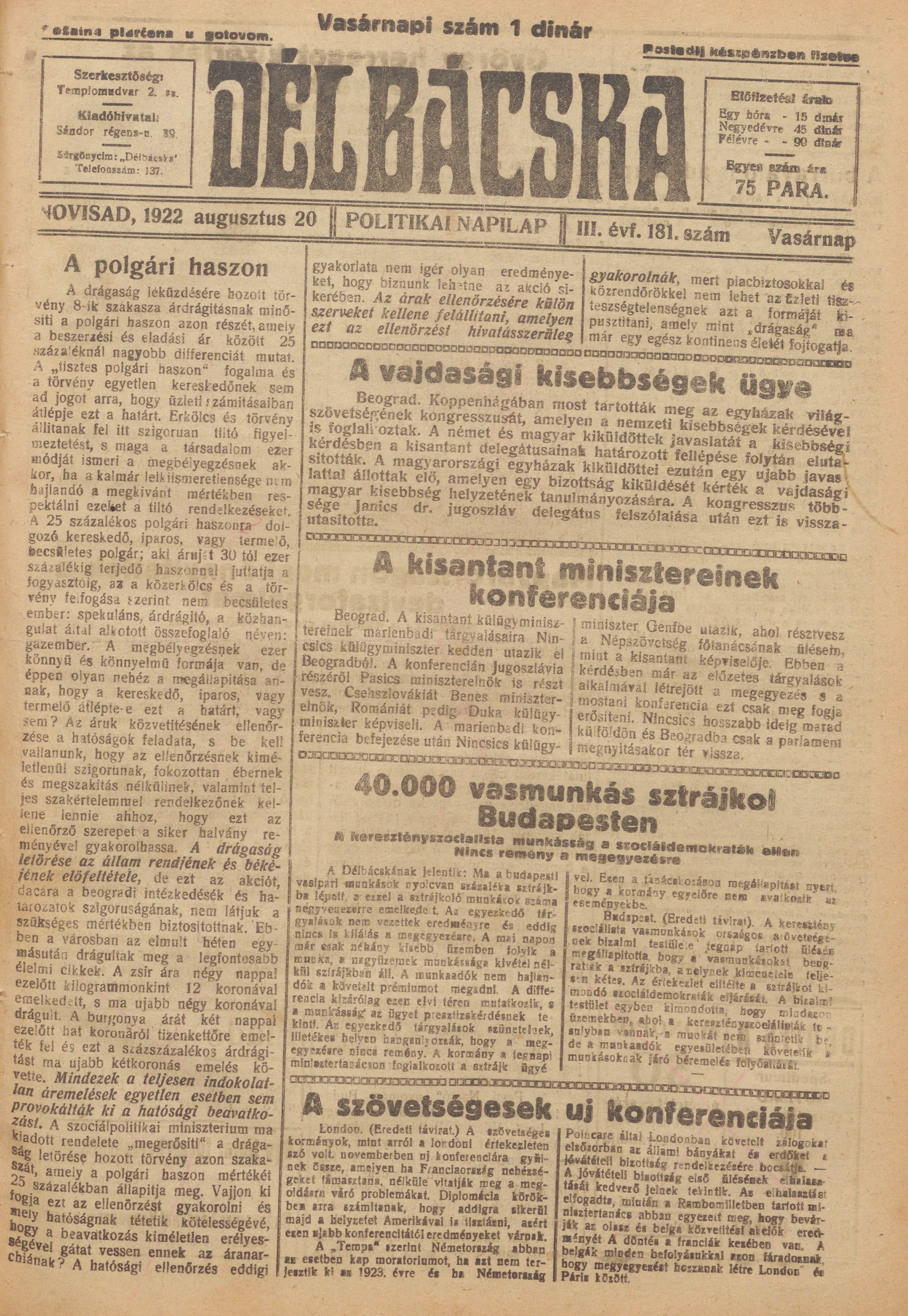 Délbácska, 3. évf. 1922. augusztus 20. 181. sz.