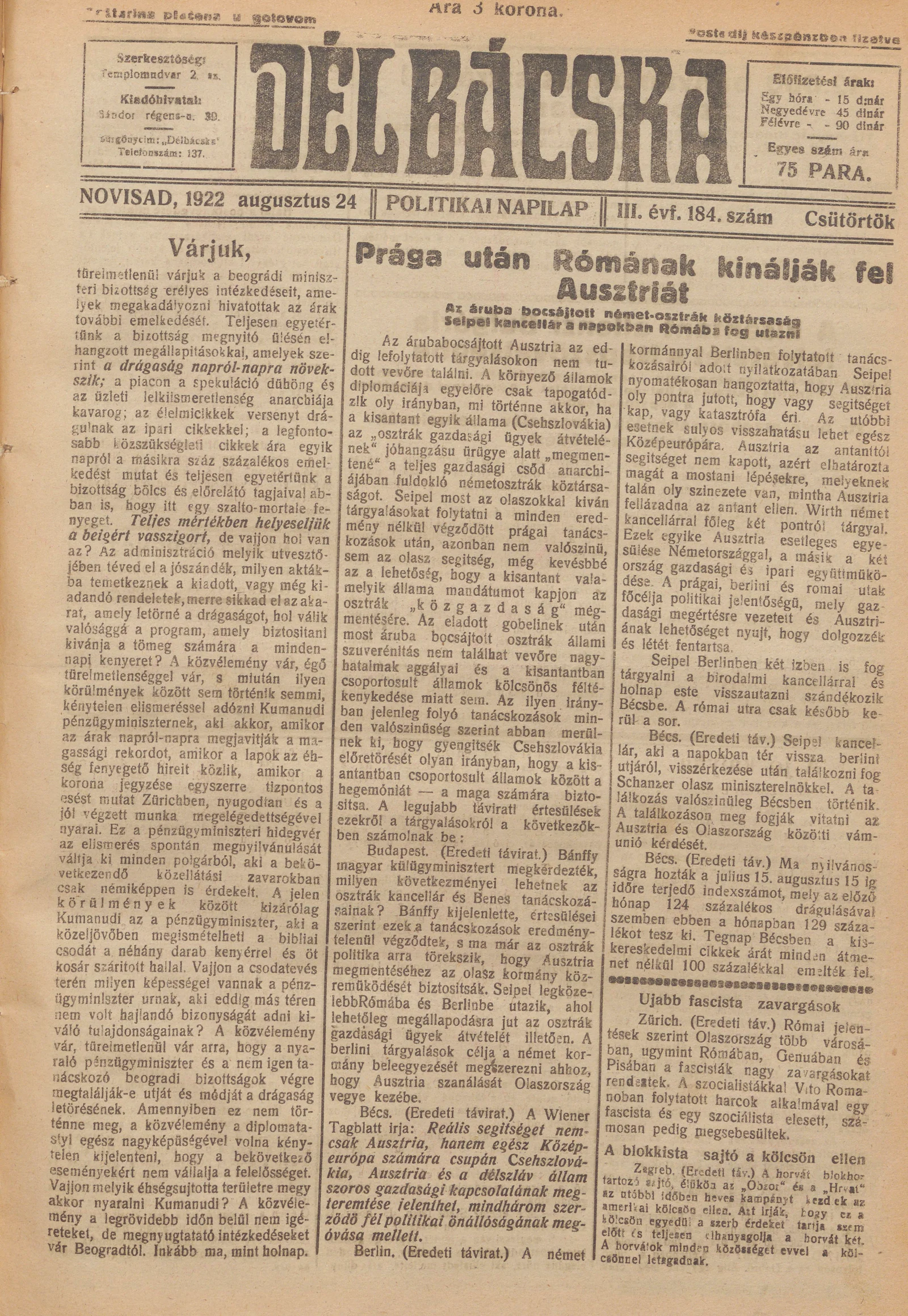 Délbácska, 3. évf. 1922. augusztus 24. 184. sz.