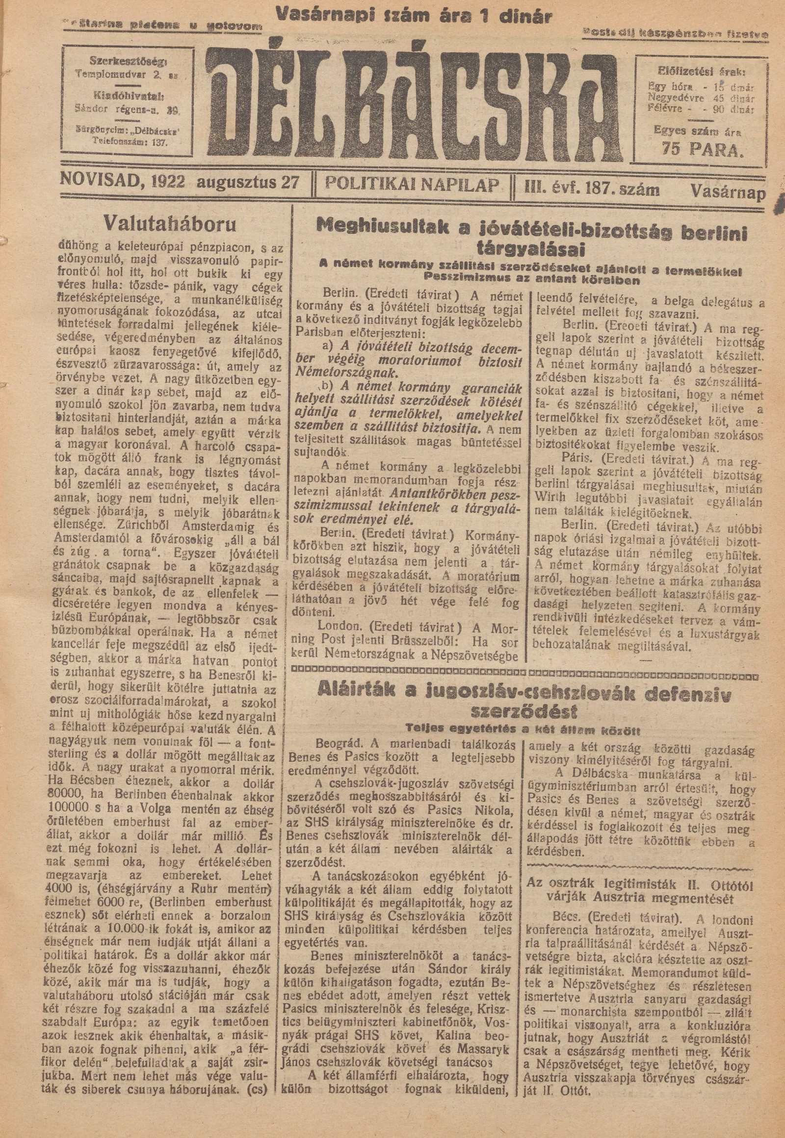 Délbácska, 3. évf. 1922. augusztus 27. 187. sz.