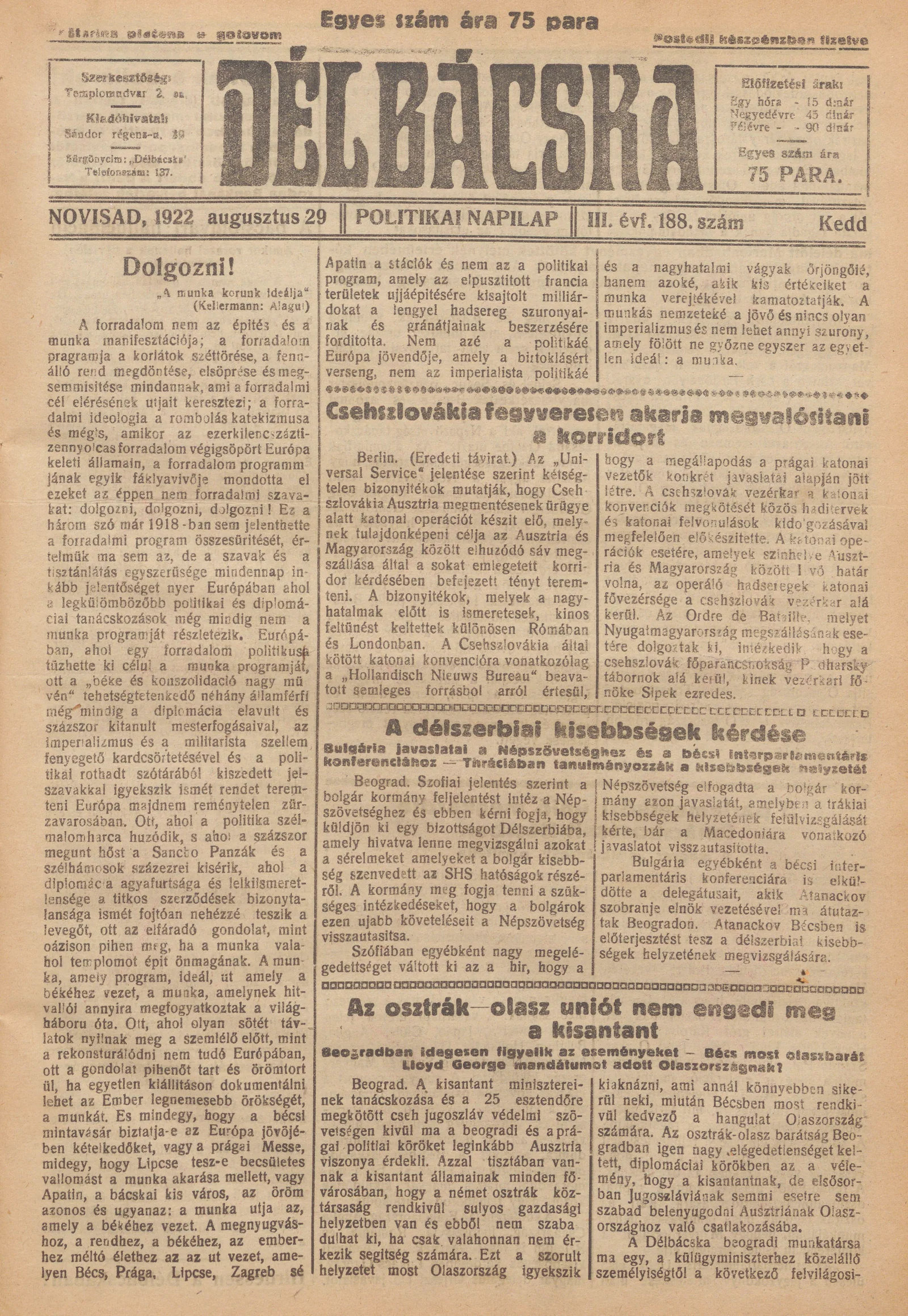 Délbácska, 3. évf. 1922. augusztus 29. 188. sz.