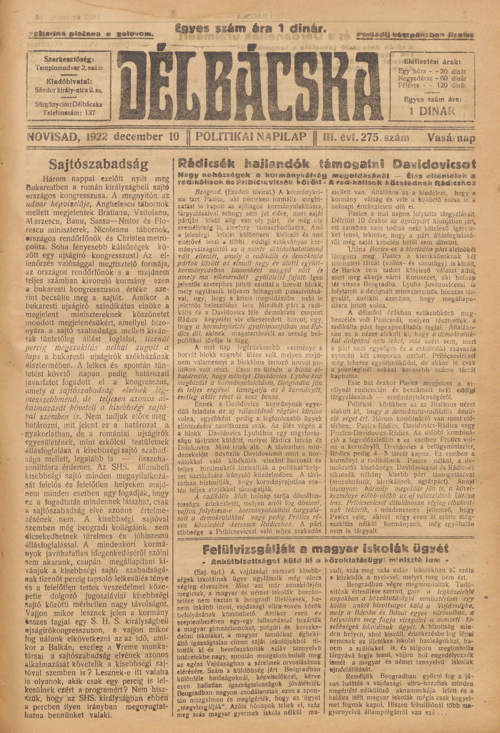 Délbácska, 3. évf. 1922. december 10. 275. sz.