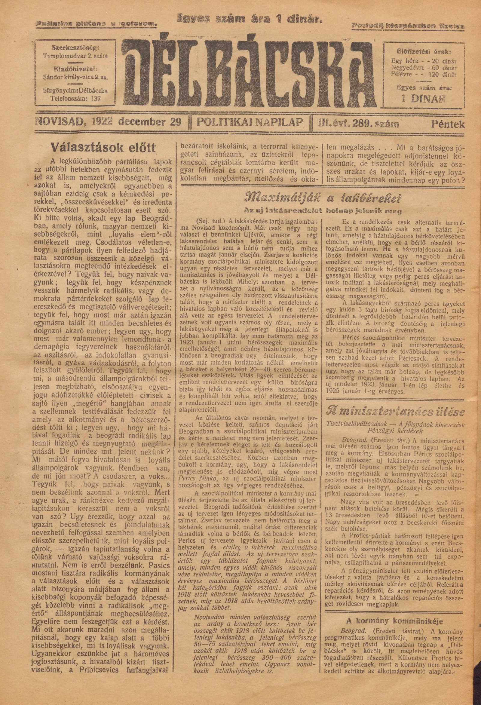 Délbácska, 3. évf. 1922. december 29. 289. sz.