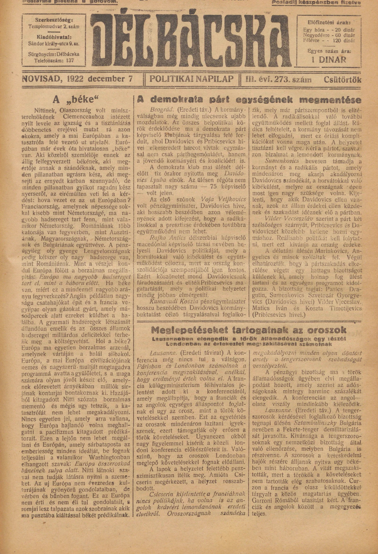 Délbácska, 3. évf. 1922. december 7. 273. sz.