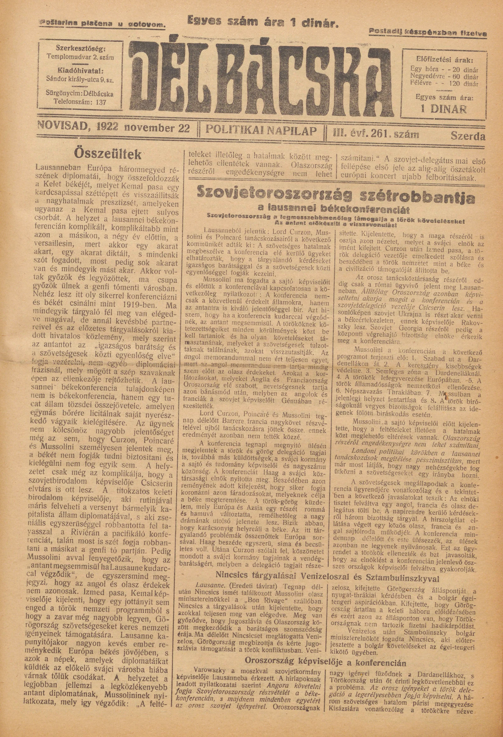 Délbácska, 3. évf. 1922. november 22. 261. sz.