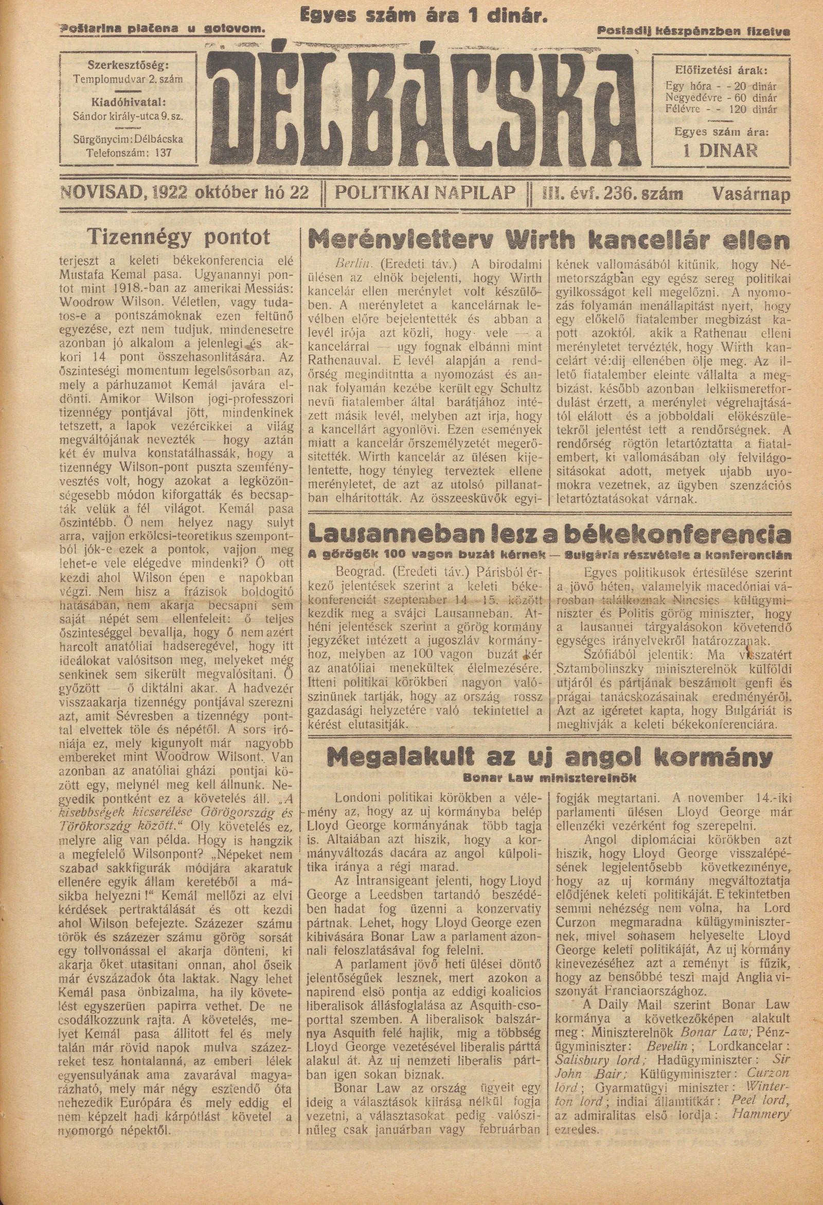 Délbácska, 3. évf. 1922. október 22. 236. sz.