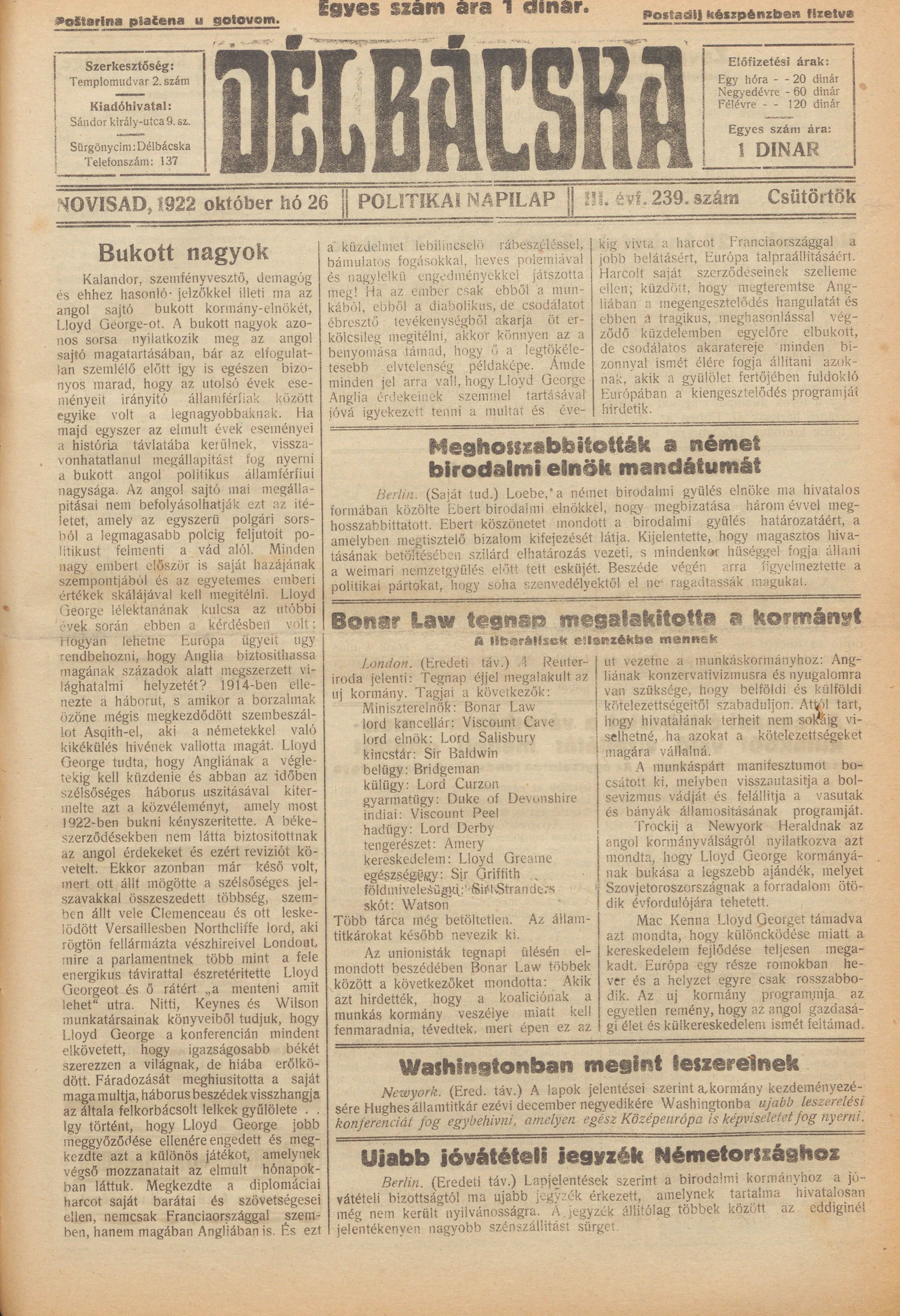 Délbácska, 3. évf. 1922. október 26. 239. sz.