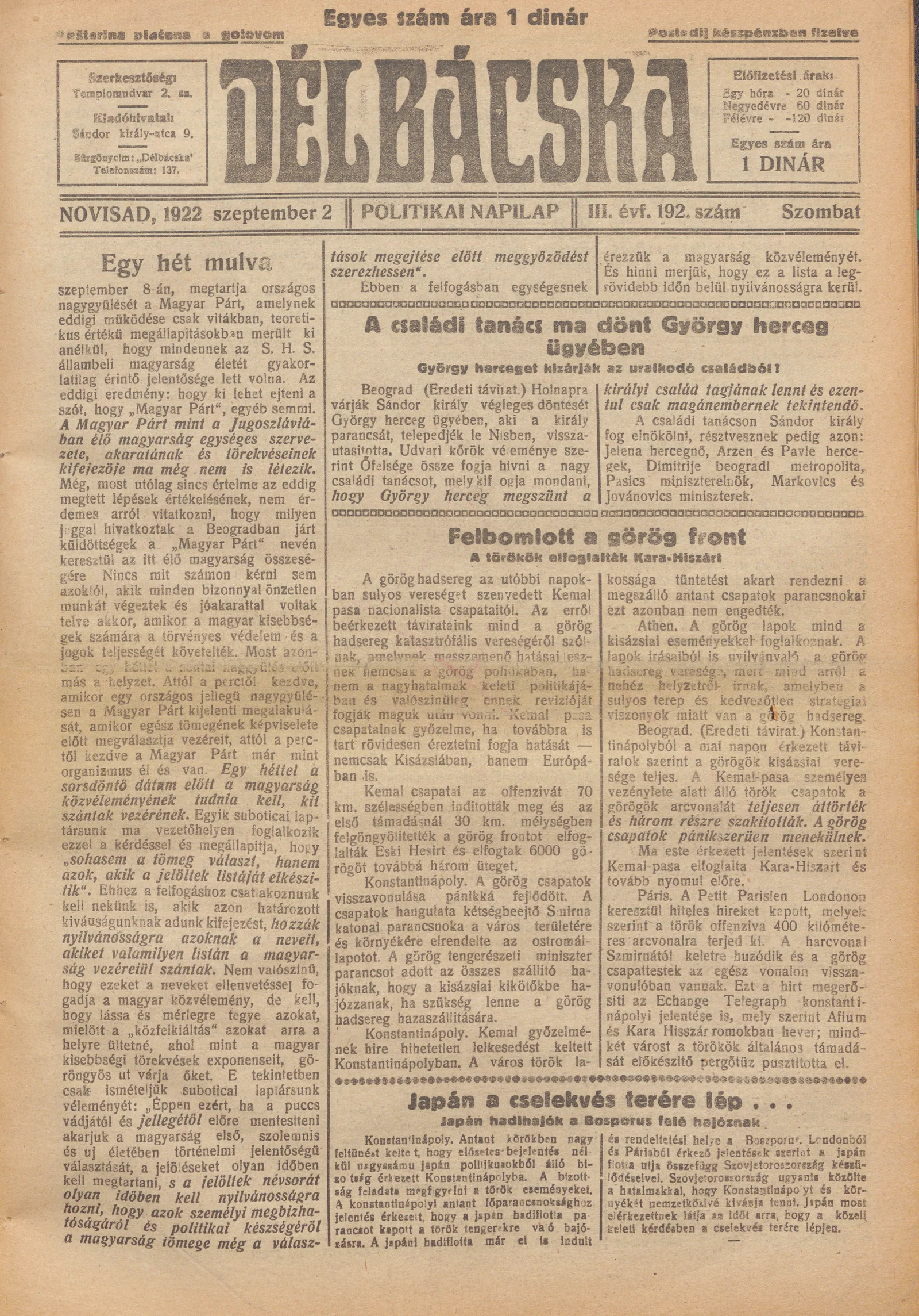 Délbácska, 3. évf. 1922. szeptember 2. 192. sz.