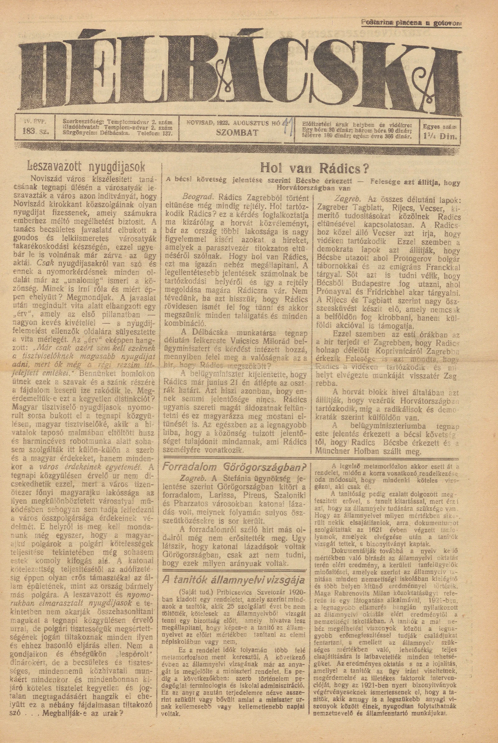 Délbácska, 4. évf. 1923. augusztus 11. 183. sz.