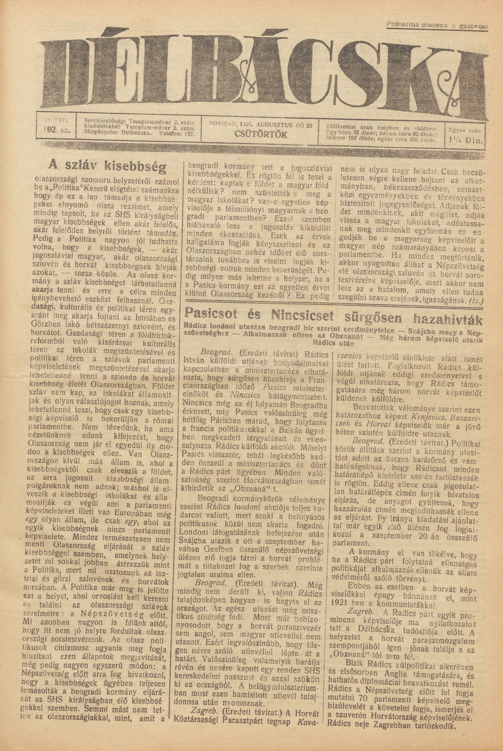 Délbácska, 4. évf. 1923. augusztus 23. 192. sz.