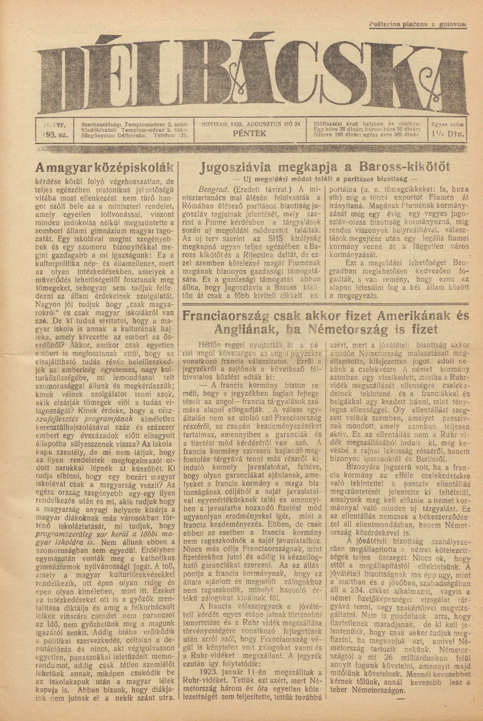 Délbácska, 4. évf. 1923. augusztus 24. 193. sz.