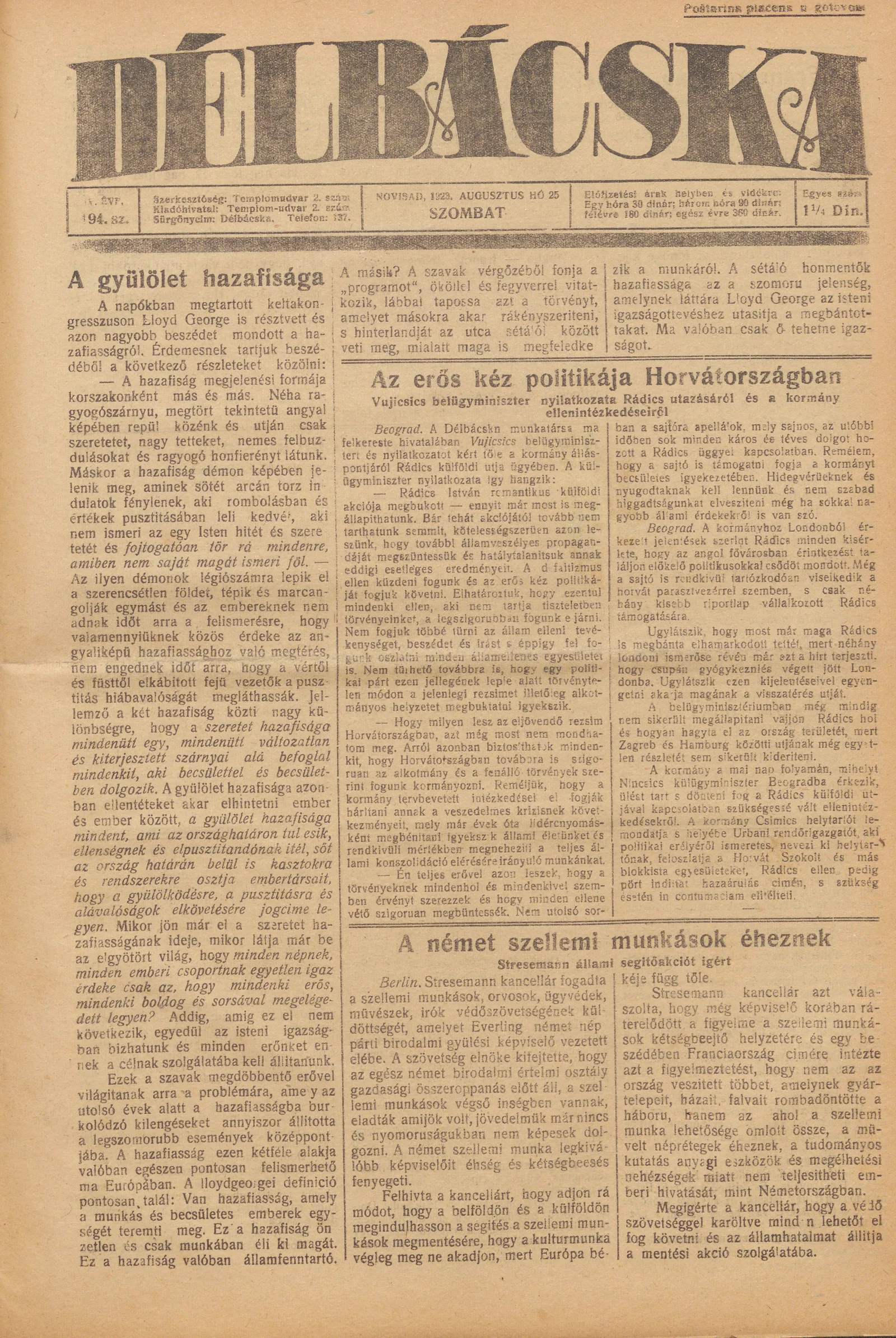 Délbácska, 4. évf. 1923. augusztus 25. 194. sz.