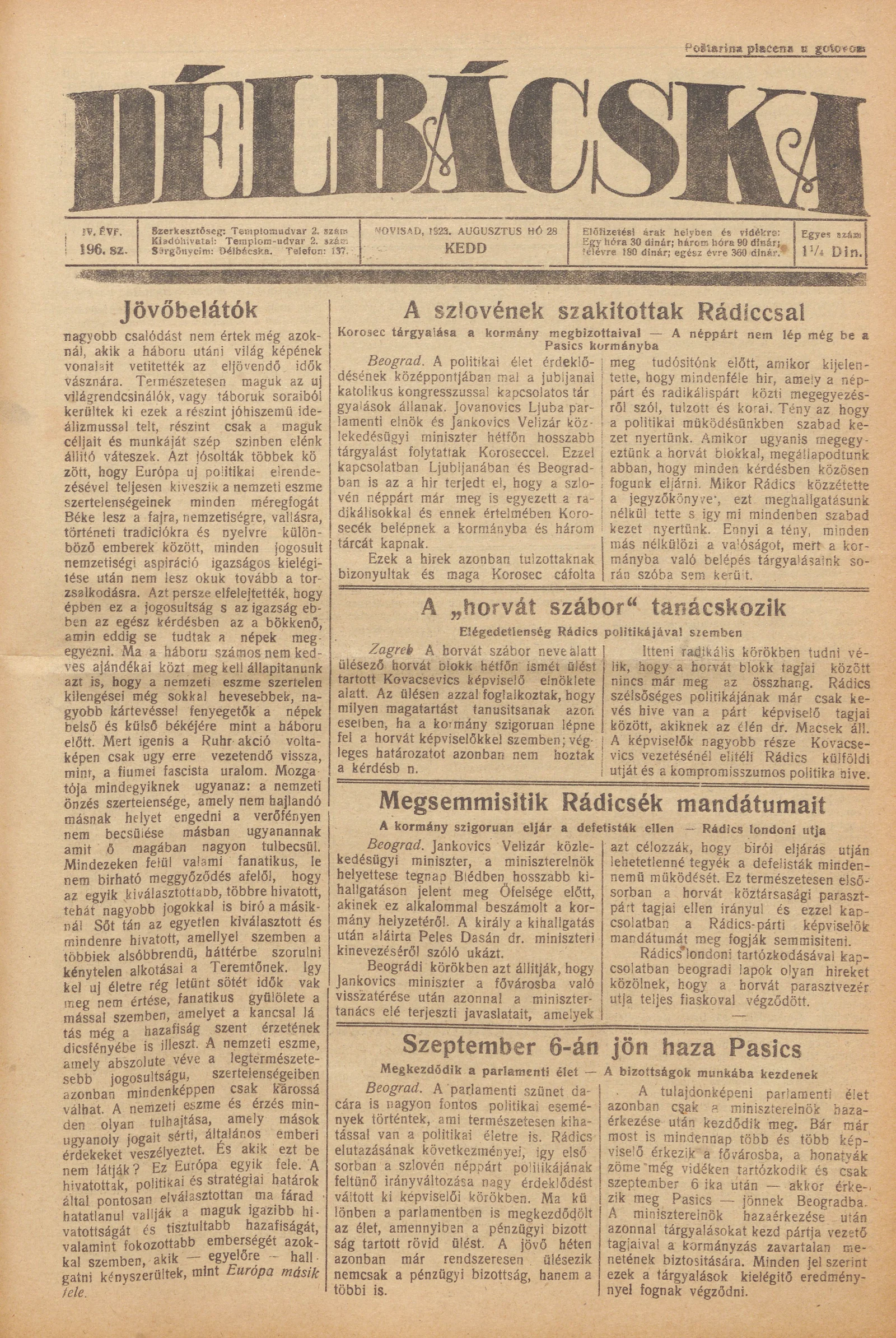 Délbácska, 4. évf. 1923. augusztus 28. 196. sz.