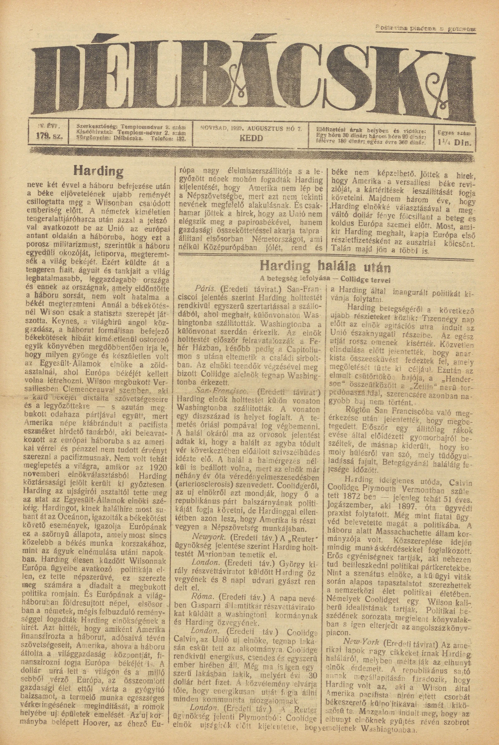 Délbácska, 4. évf. 1923. augusztus 7. 179. sz.