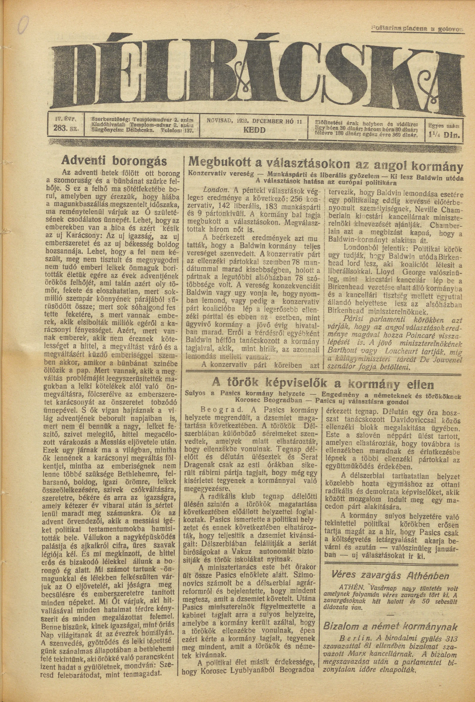 Délbácska, 4. évf. 1923. december 11. 283. sz.