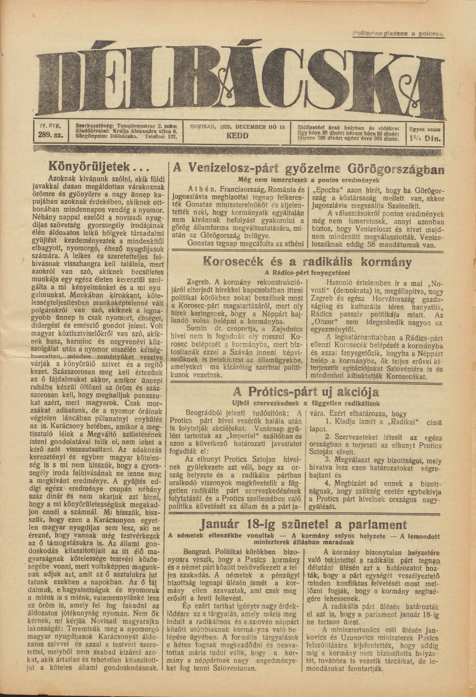 Délbácska, 4. évf. 1923. december 18. 289. sz.