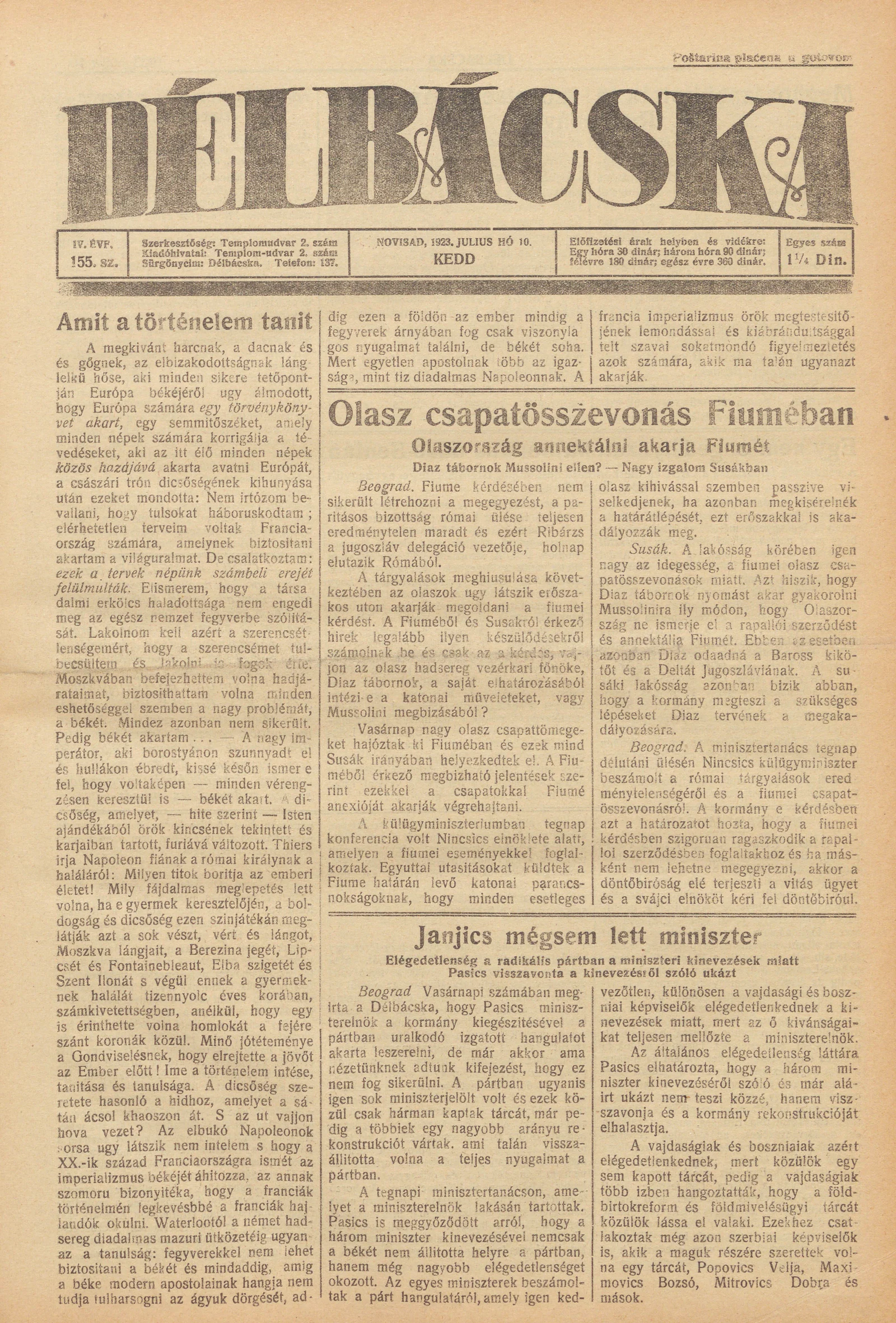 Délbácska, 4. évf. 1923. július 10. 155. sz.
