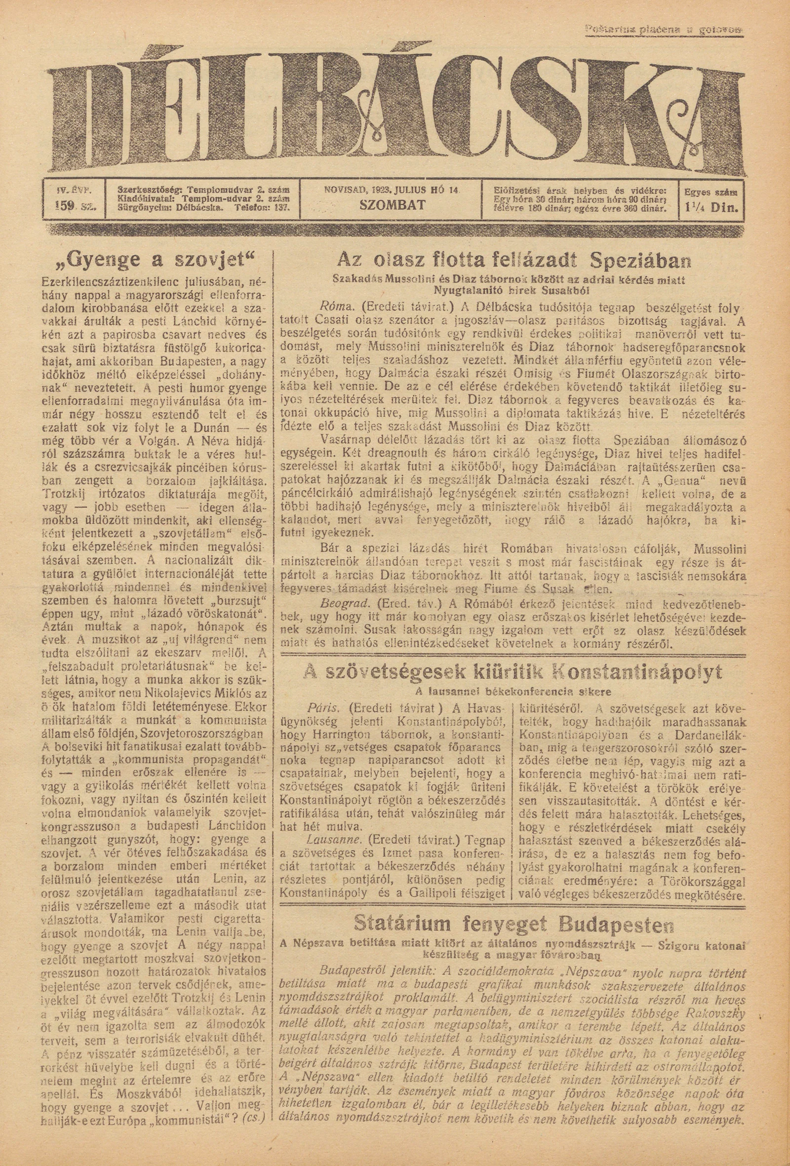 Délbácska, 4. évf. 1923. július 14. 159. sz.