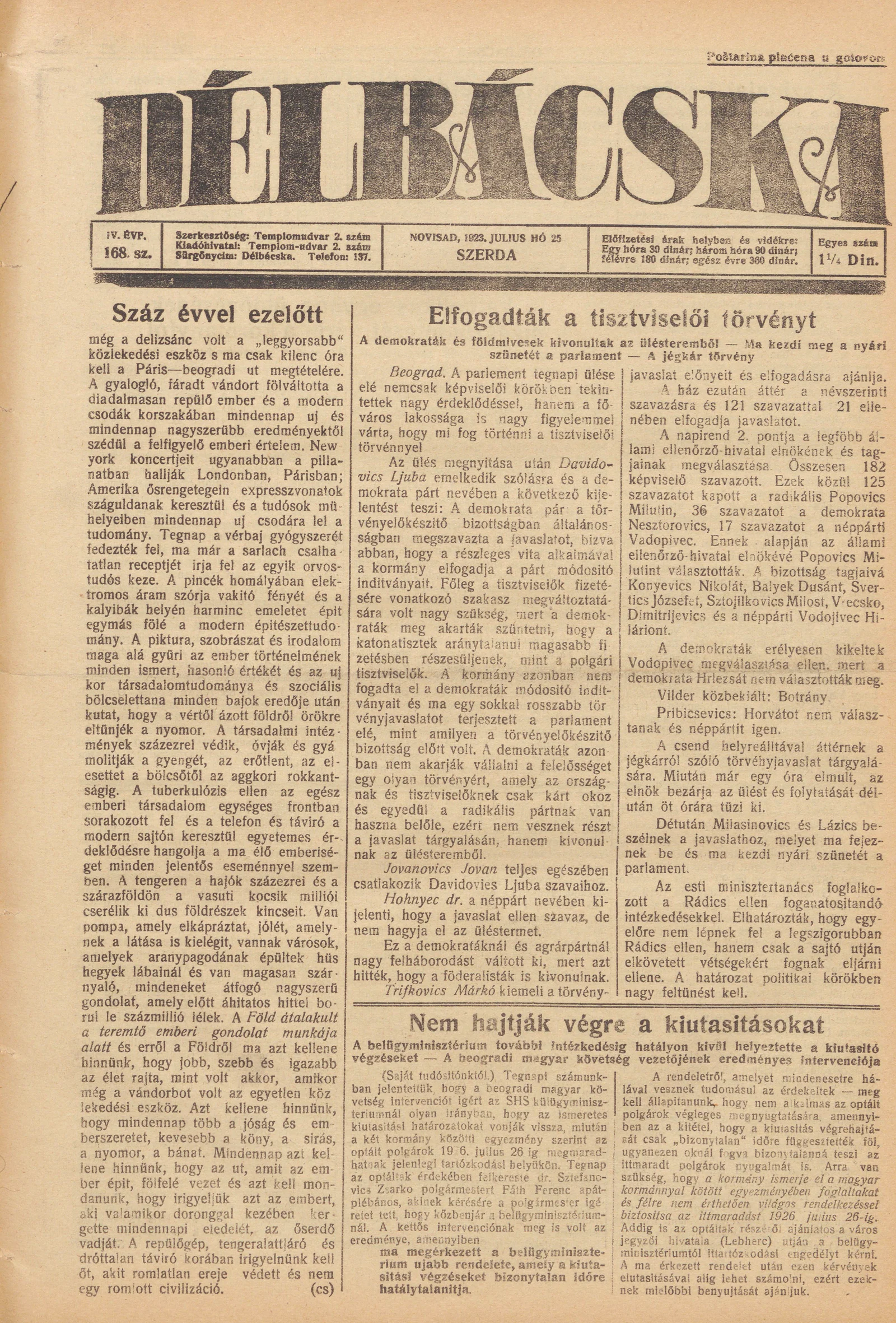 Délbácska, 4. évf. 1923. július 25. 168. sz.