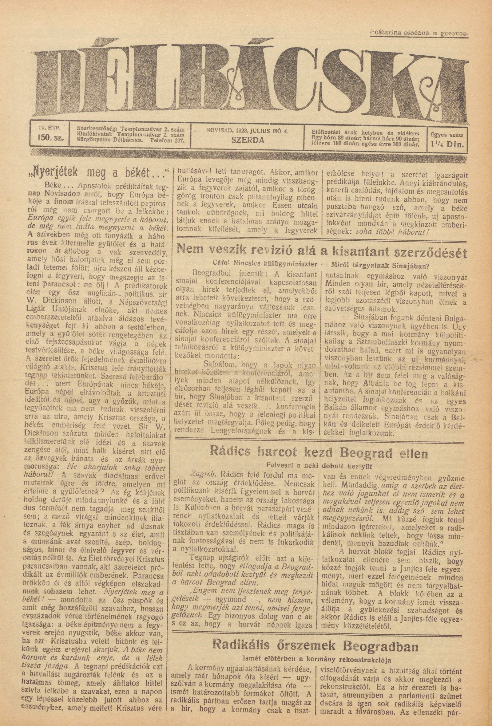 Délbácska, 4. évf. 1923. július 4. 150. sz.