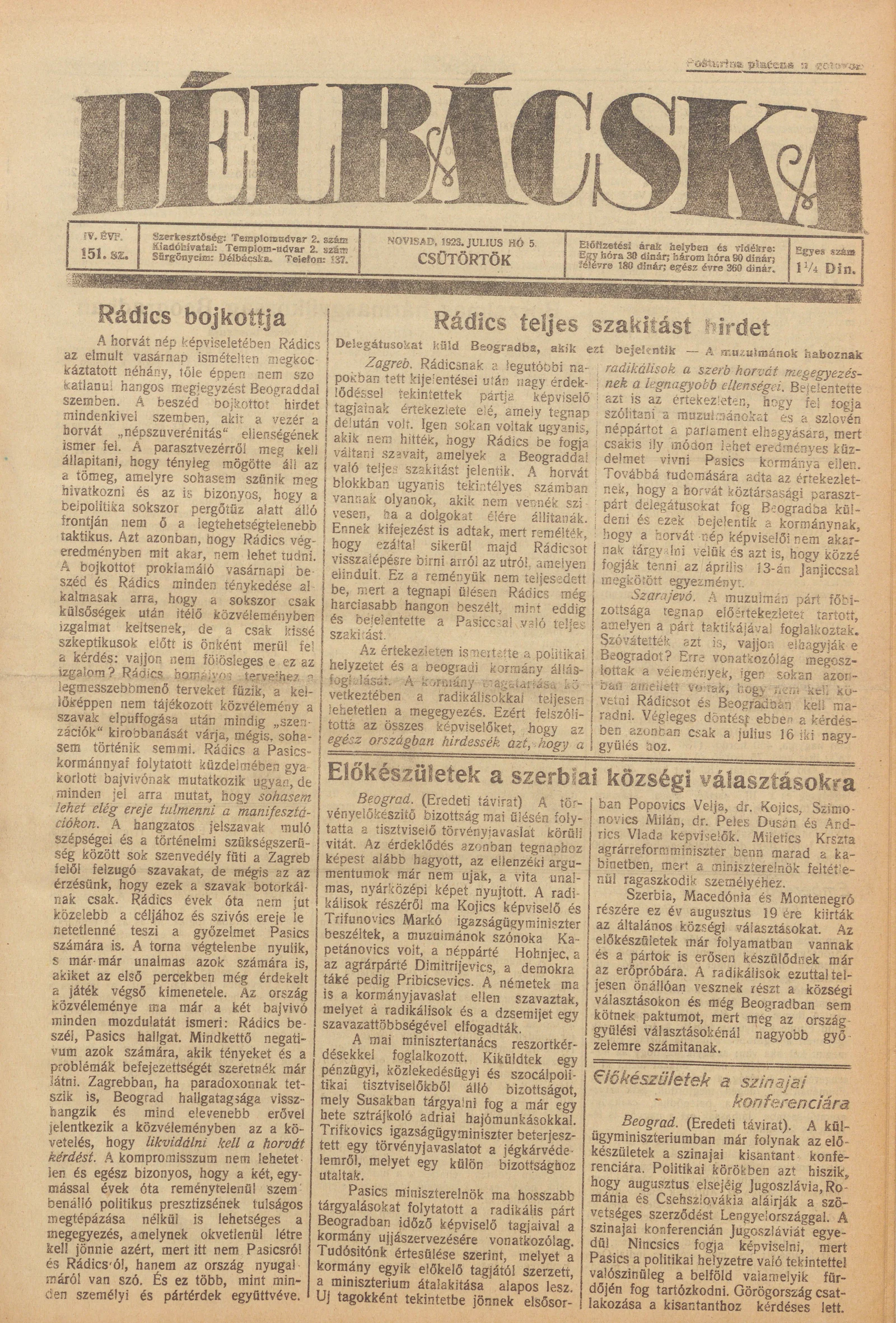Délbácska, 4. évf. 1923. július 5. 151. sz.