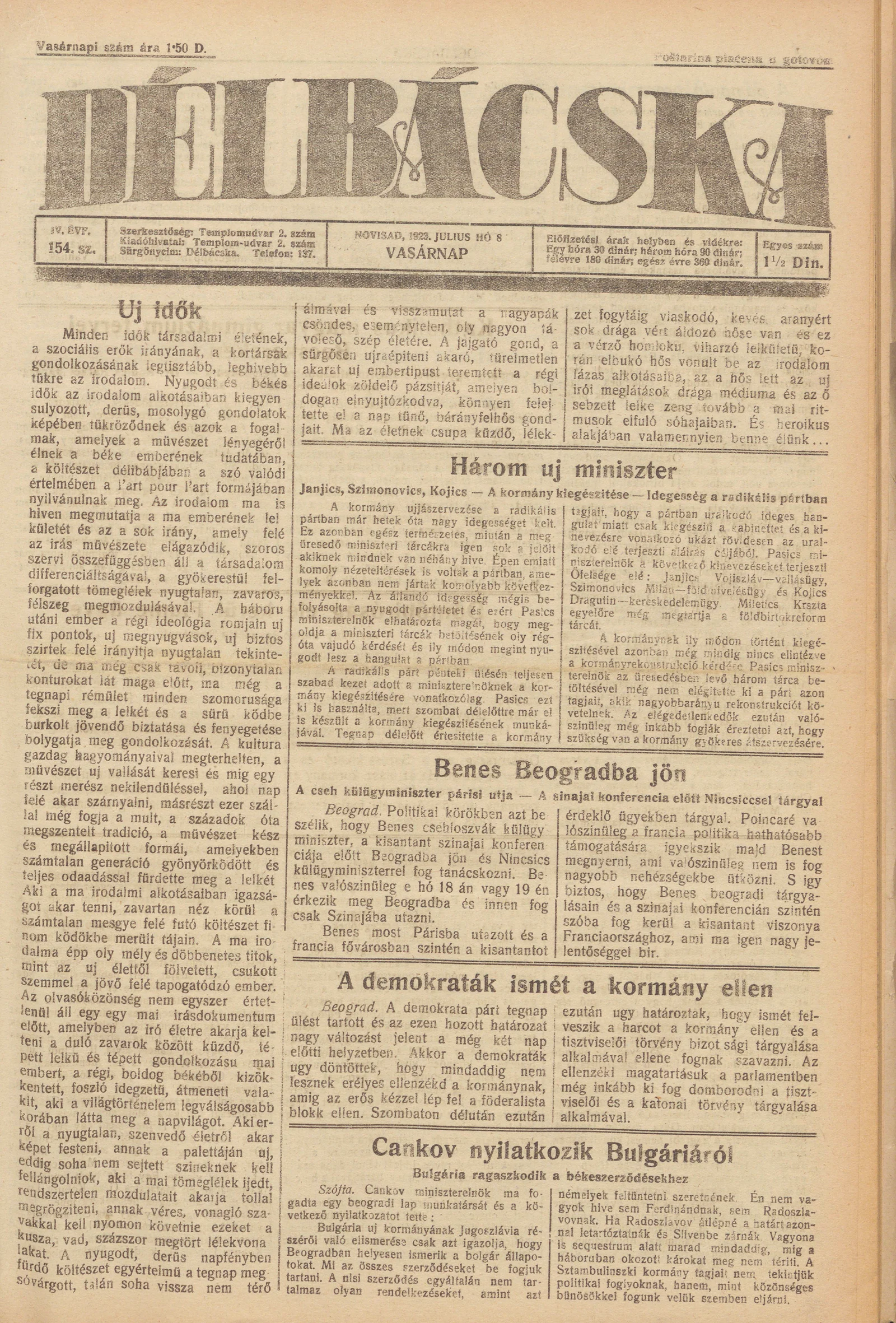 Délbácska, 4. évf. 1923. július 8. 154. sz.