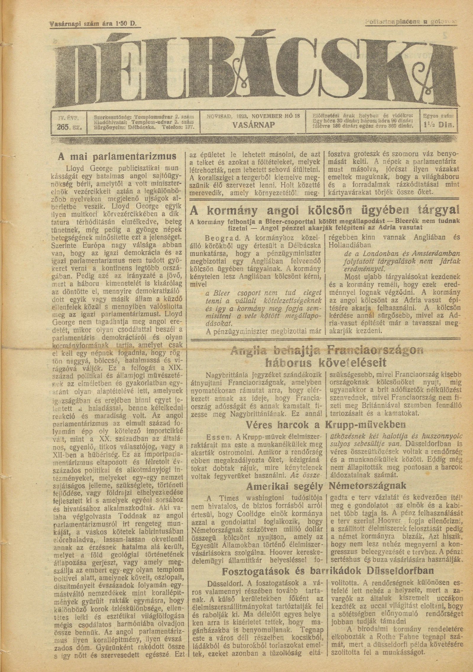 Délbácska, 4. évf. 1923. november 18. 265. sz.