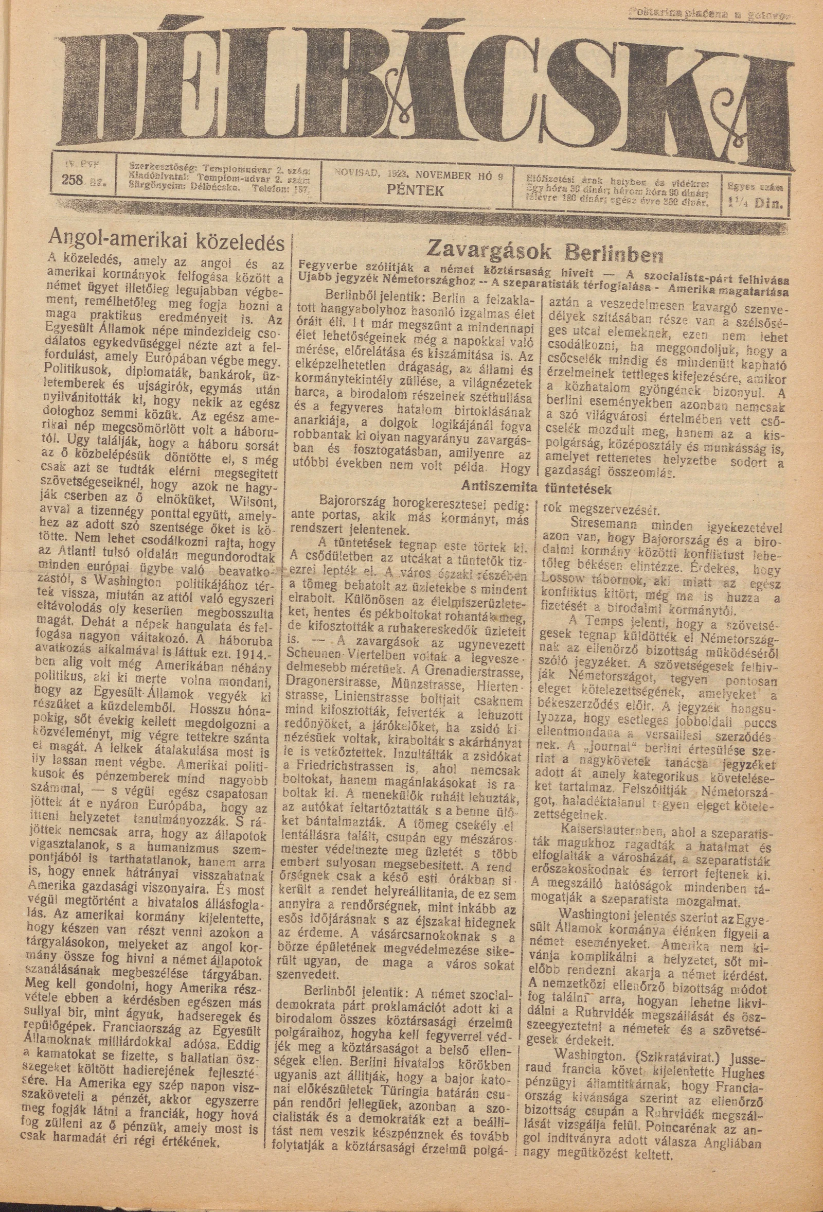 Délbácska, 4. évf. 1923. november 9. 258. sz.