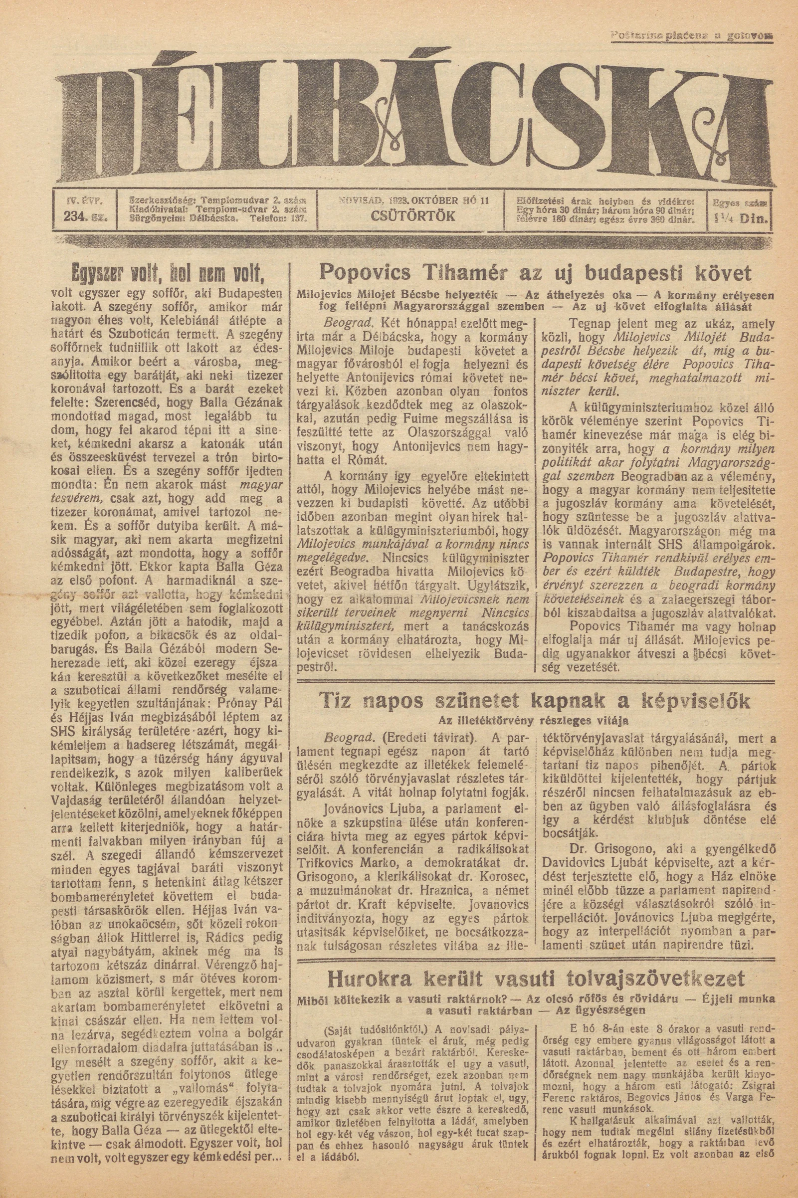 Délbácska, 4. évf. 1923. október 11. 234. sz.