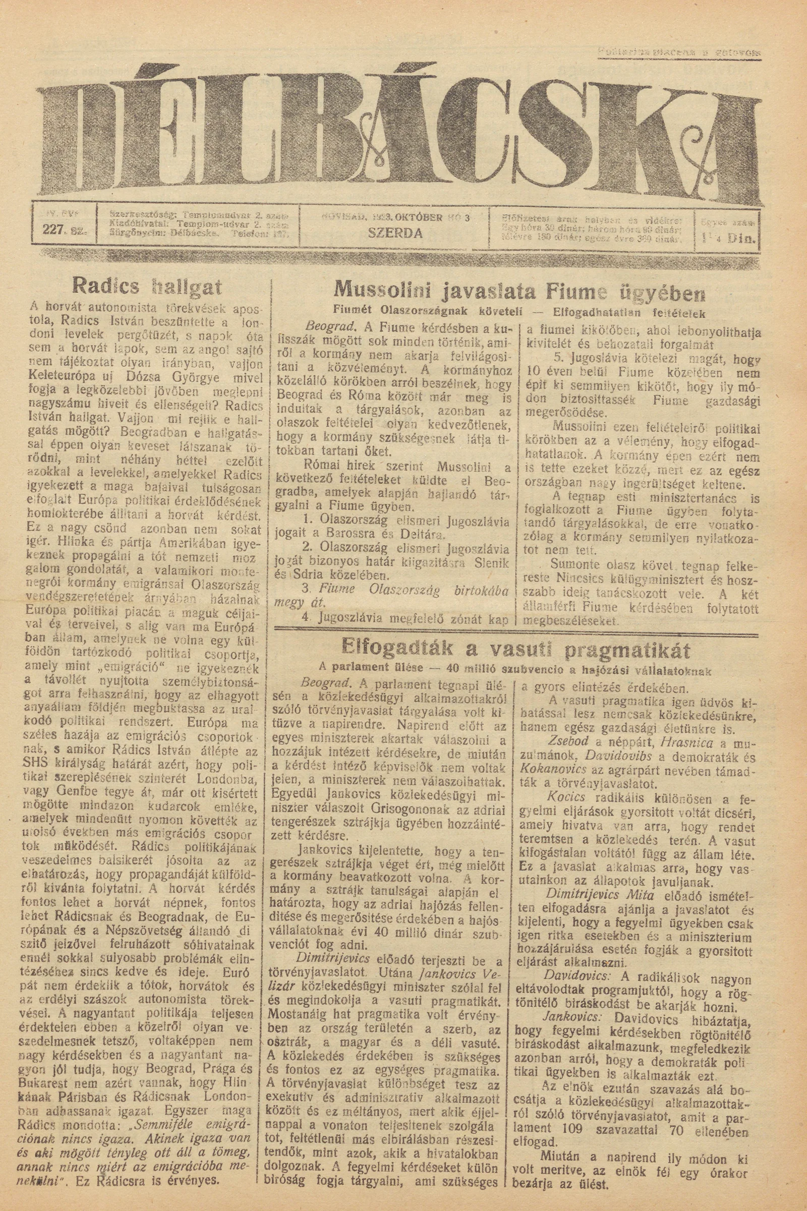 Délbácska, 4. évf. 1923. október 3. 227. sz.