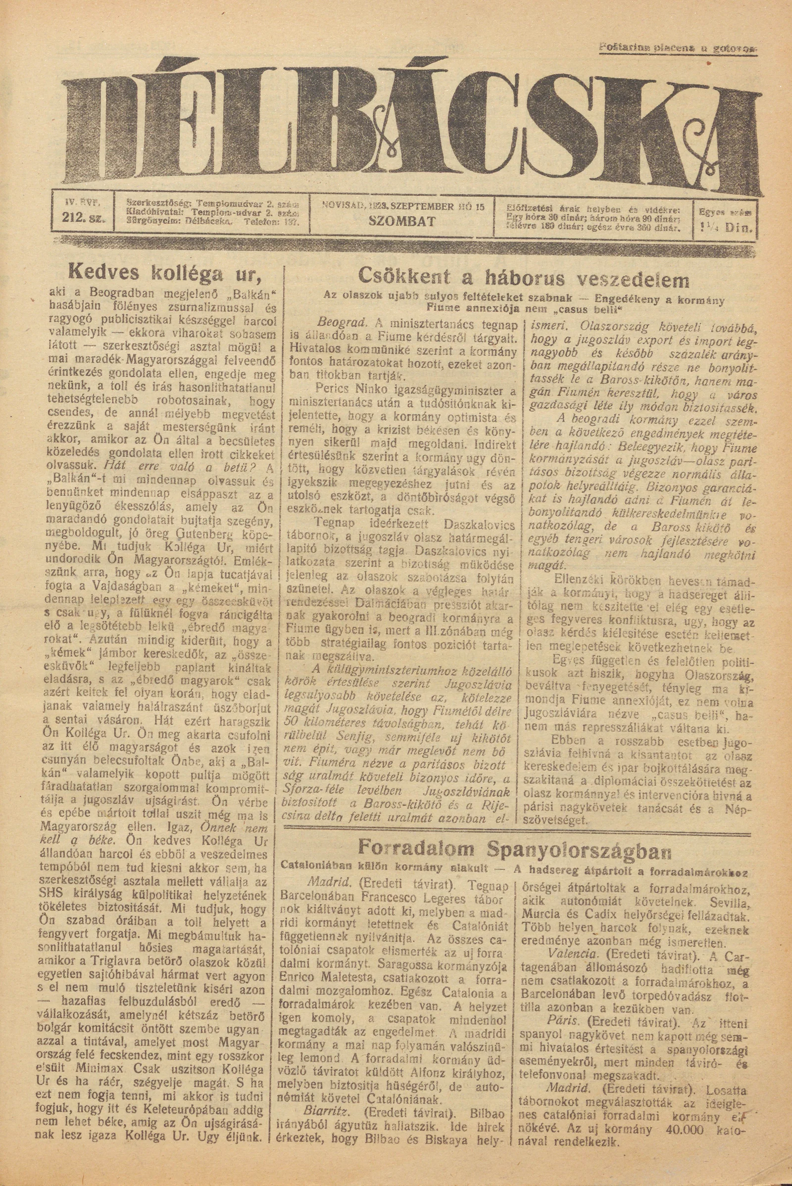Délbácska, 4. évf. 1923. szeptember 15. 212. sz.