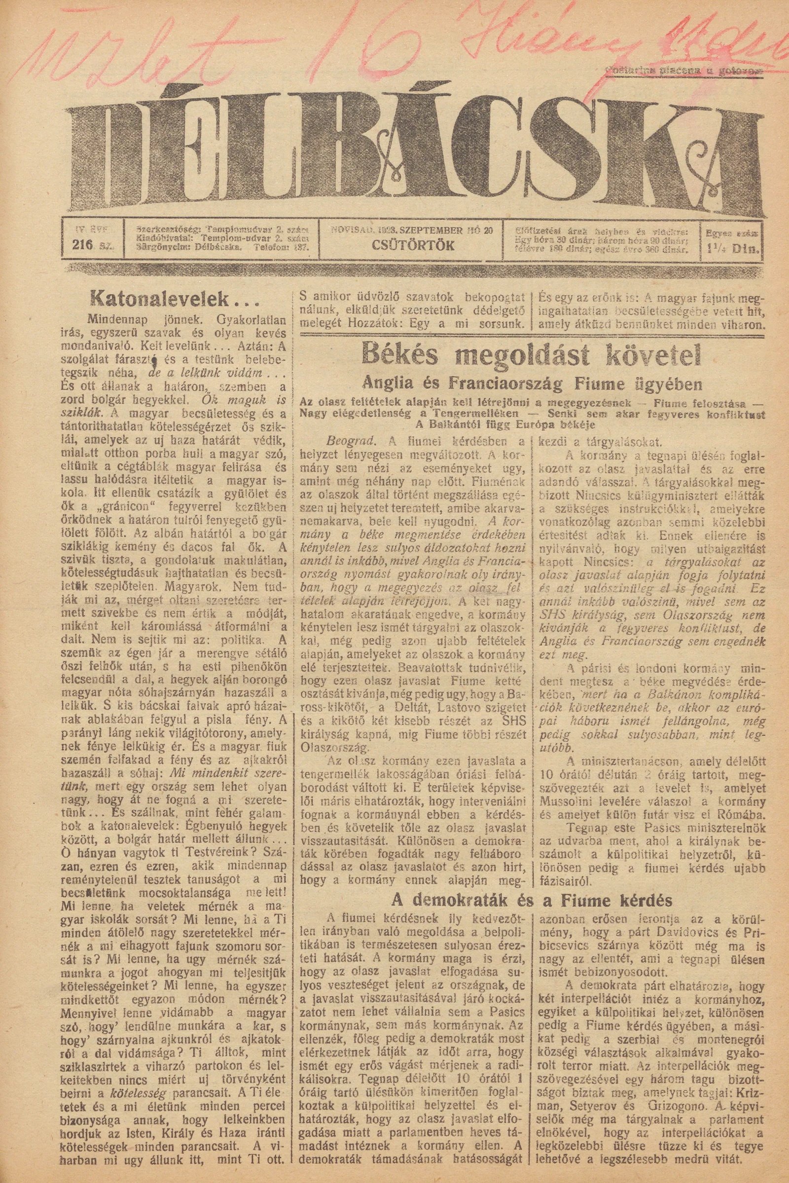 Délbácska, 4. évf. 1923. szeptember 20. 216. sz.