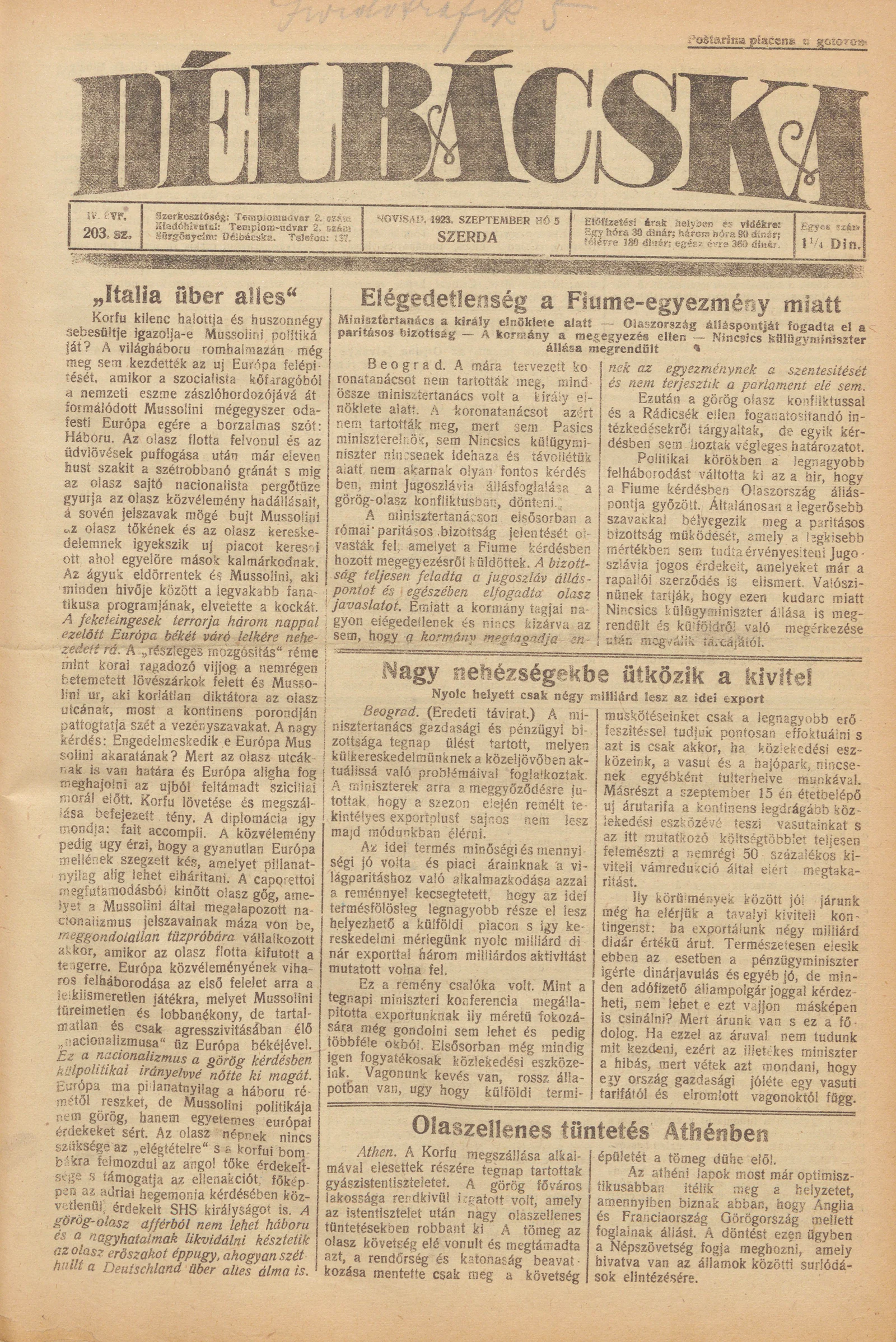 Délbácska, 4. évf. 1923. szeptember 5. 203. sz.