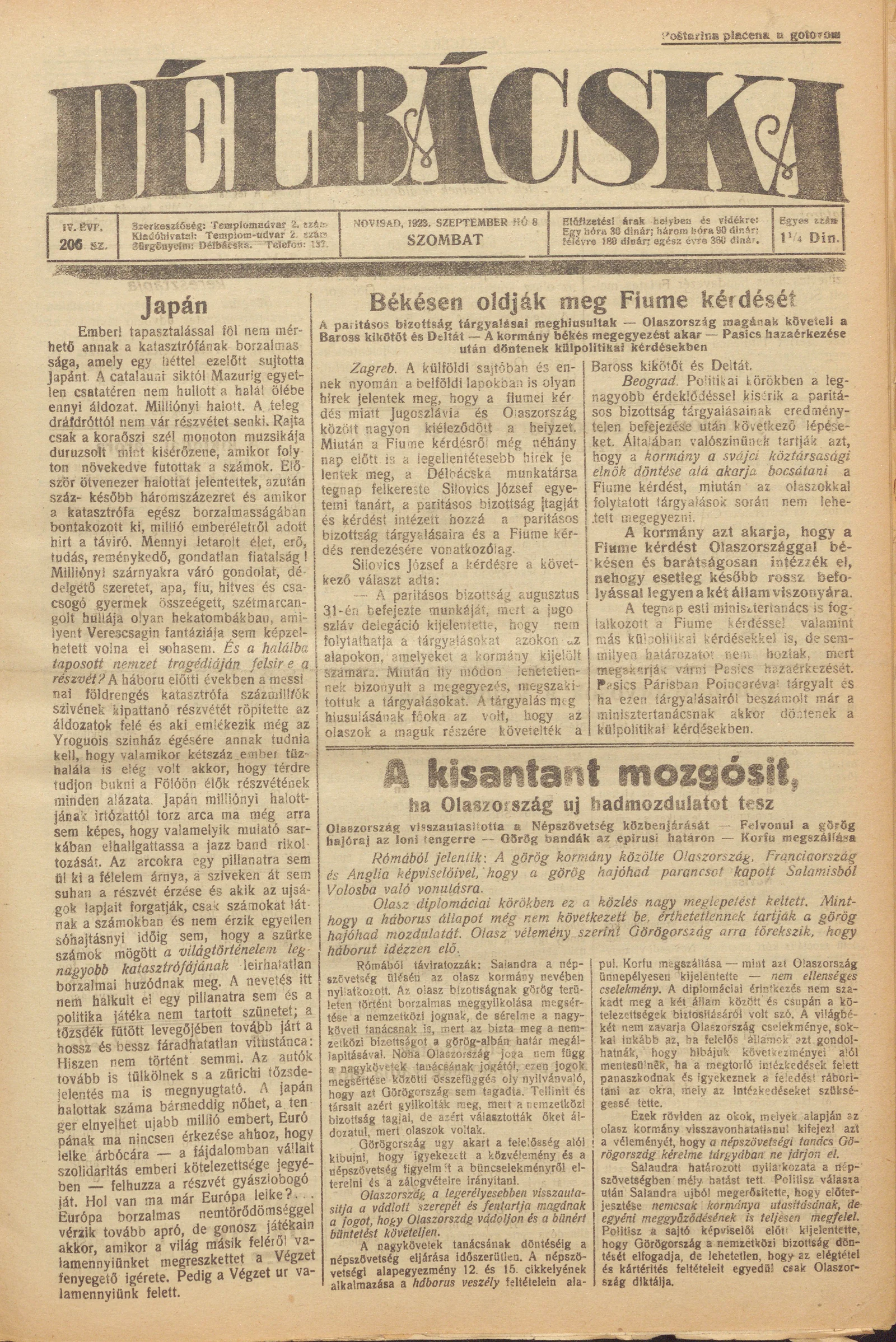 Délbácska, 4. évf. 1923. szeptember 8. 206. sz.