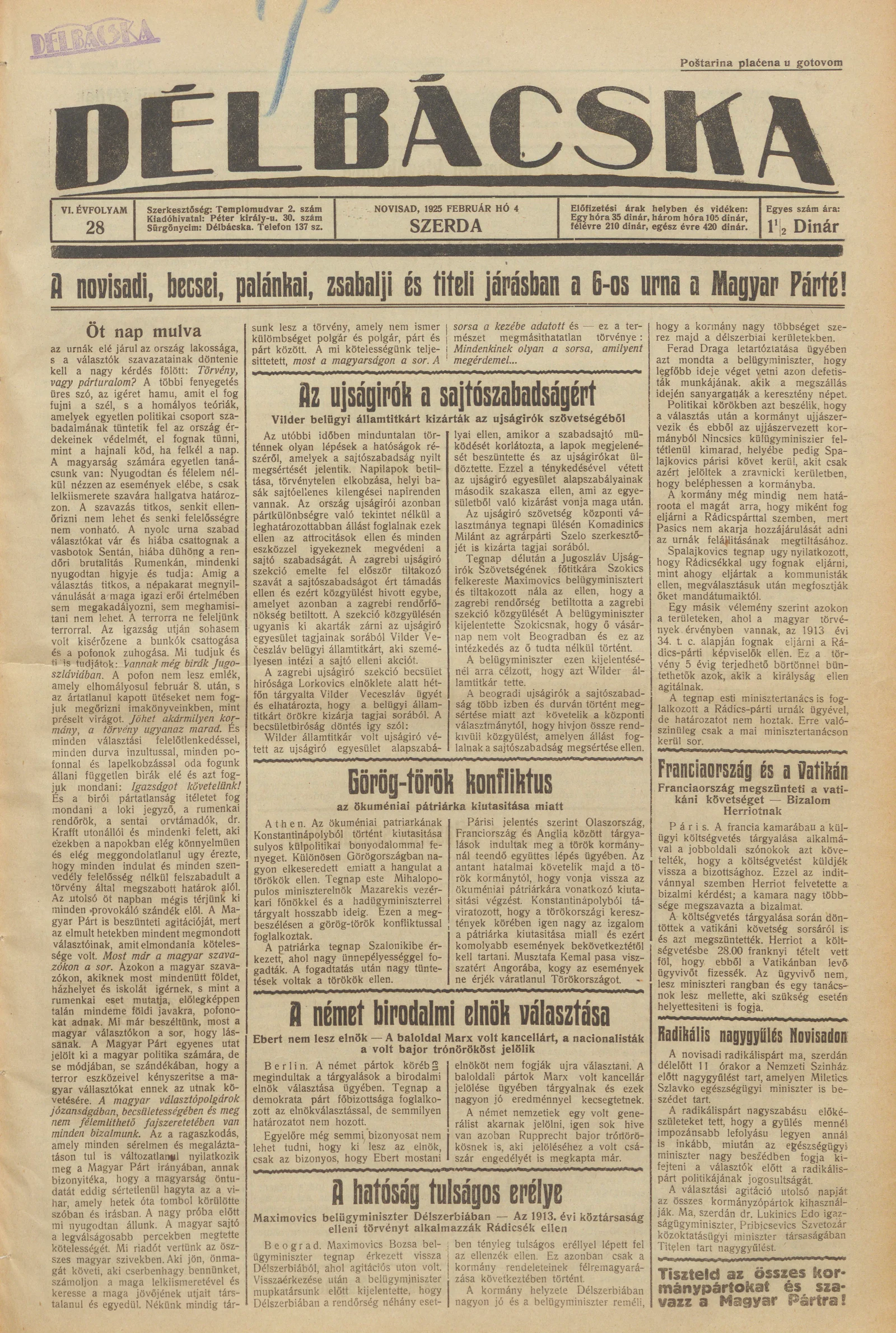 Délbácska, 4. évf. 1925. február 4. 28. sz.