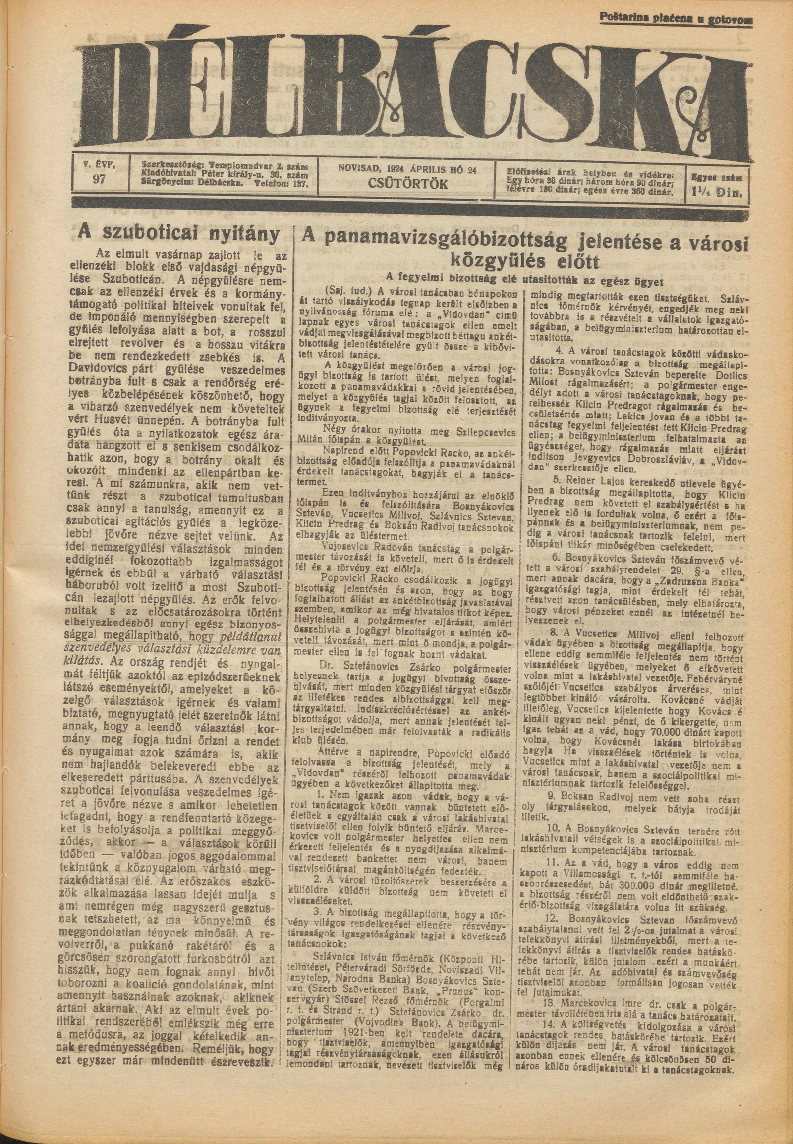 Délbácska, 5. évf. 1924. április 24. 97. sz.